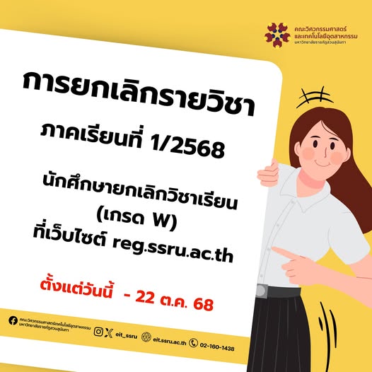 ประกาศการยกเลิกรายวิชา ประจำภาคเรียนที่ 1 ปีการศึกษา 2568 ที่เว็บไซต์ reg.ssru.ac.th ตั้งแต่วันนี้ - 22 ตุลาคม 2568