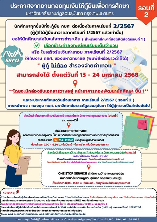รอบที่ 2 ขอให้นักศึกษาส่งใบแจ้งการชำระเงิน (สำหรับนักศึกษาที่ยังไม่ได้ส่งในรอบที่ 1) เลือกชำระค่าลงทะเบียนเรียนเต็มจำนวนหรือใบเสร็จรับเงินค่าเทอมภาคเรียนที่ 2/2567 ให้กับงาน กยศ. ของมหาวิทยาลัย (พิมพ์สีหรือขาวดำก็ได้) ** ผู้กู้ ไม่ต้อง สำรองจ่ายค่าเทอม ** ส่่งได้ตั้งแต่วันที่ 13 - 24 มกราคม 2568 ส่งเอกสารได้ที่ : หน้าอาคารกองพัฒนานักศึกษา ชั้น 1