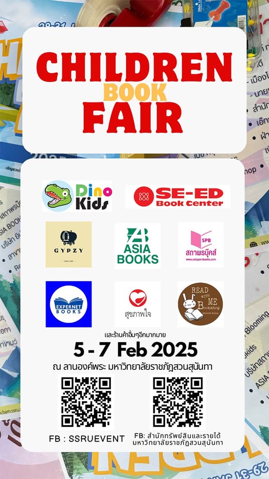 งานหนังสือ “ChildrenBookFair2025 " ครั้งแรกของปี 2568 (วันที่ 5 ก.พ. 68 - 7 ก.พ. 68) เวลา : 08.00 - 16.00 น. ลานองค์พระ มหาวิทยาลัยราชภัฏสวนสุนันทา