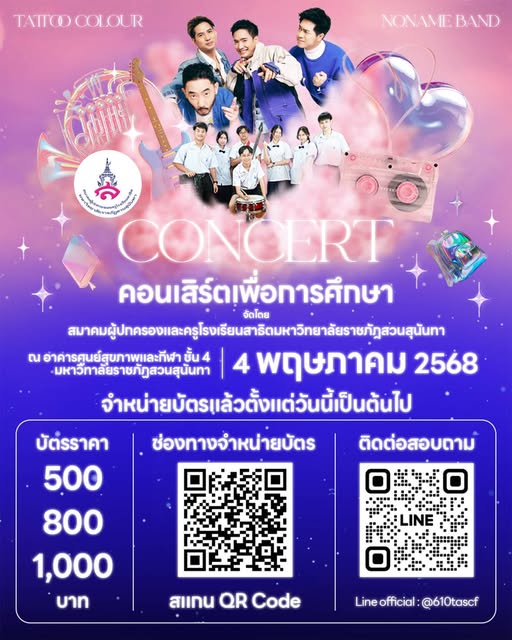 กิจกรรมคอนเสิร์ตเพื่อการศึกษา จัดโดยสมาคมผู้ปกครองและครูโรงเรียนสาธิตมหาวิทยาลัยราชภัฏสวนสุนันทา ซึ่งจะมีขึ้นในวันอาทิตย์ที่ 4 พฤษภาคม 2568 เวลา 17.00 - 21.00 น. ณ อาคารศูนย์สุขภาพและกีฬา ชั้น 4 มหาวิทยาลัยราชภัฏสวนสุนันทา สั่งซื้อบัตรเข้างานได้ตั้งแต่วันนี้เป็นต้นไป เตรียมตัวมาพบกับความสนุก สุขใจกับศิลปินวง tattoo color และยังมีวงดนตรีนักเรียนของเราในวง NONAME BAND ที่จะทำให้ทุกคนสนุกไปพร้อมๆ กัน