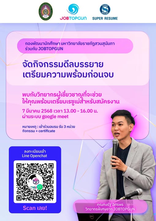 กองพัฒนานักศึกษาร่วมกับ Jobtopgun จัดกิจกรรมเตรียมความพร้อมก่อนจบ 7 มีนาคม 2568 เวลา 13.00 - 16.00 น. ผ่านระบบ Google Meet จำกัดเพียง 200 คนเท่านั้น เข้าร่วมอบรมรับ 3 หน่วยกิจกรรมและใบ Certificate