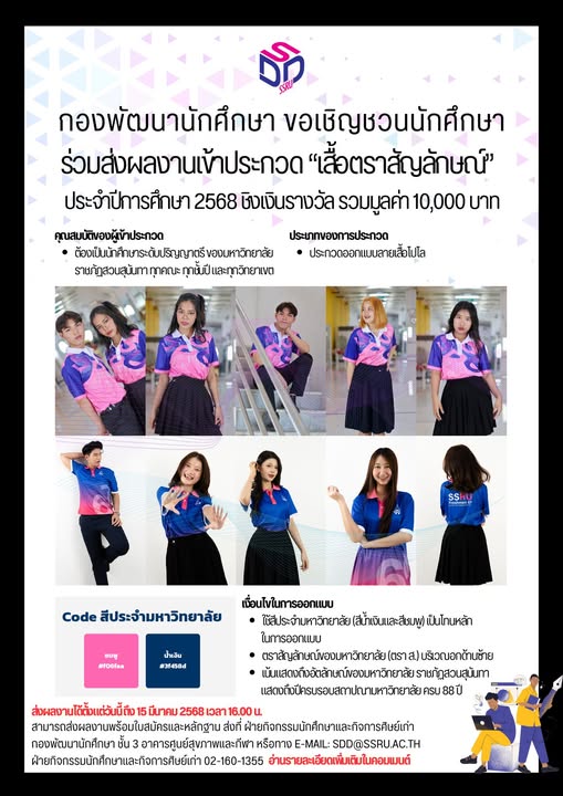 กองพัฒนานักศึกษา ขอเชิญชวนนักศึกษาร่วมส่งผลงานเข้าประกวด “เสื้อตราสัญลักษณ์” ประจำปีการศึกษา 2568 ชิงเงินรางวัลรวมมูลค่า 10,000 บาท