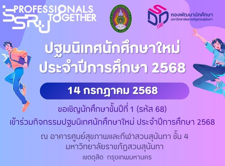 ปฐมนิเทศนักศึกษาใหม่ 2568 จุดประกายความเป็นมืออาชีพ SSRU Professionals Together ณ อาคารศูนย์สุขภาพและกีฬาชั้น 4 มหาวิทยาลัยราชภัฏสวนสุนันทา