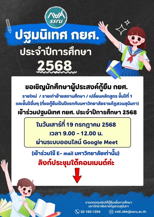 ขอเชิญนักศึกษาผู้ประสงค์กู้ยืม กยศ. (รายใหม่, รายเก่าย้ายสถานศึกษา, เปลี่ยนหลักสูตรชั้นปีที่ 1 และชั้นปีอื่นๆ) เข้าร่วมปฐมนิเทศ กยศ. ประจำปีการศึกษา 2568