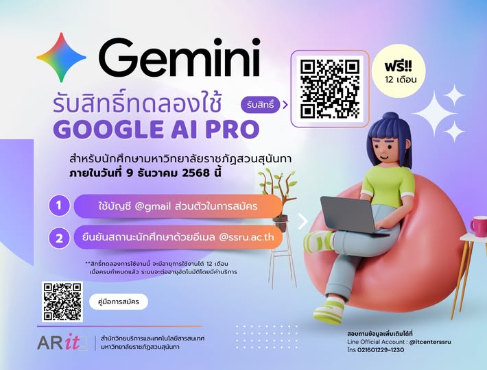 สำนักวิทยบริการและเทคโนโลยีสารสนเทศ เชิญชวนนักศึกษาทุกชั้นปีลงทะเบียนใช้งาน Gemini แพ็กเกจ Pro ฟรี ตลอด 1 ปีเต็ม (ไม่มีค่าใช้จ่าย) ลงทะเบียนภายในวันที่ 9 ธันวาคม 2568