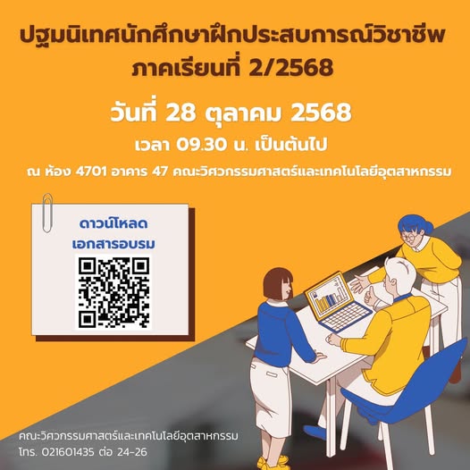 ขอแจ้งการปฐมนิเทศนักศึกษาฝึกประสบการณ์วิชาชีพ ภาคเรียนที่ 2/2568 ในวันที่ 28 ตุลาคม 2568 เวลา 09.30 น. ณ ห้อง 4701 อาคาร 47 คณะวิศวกรรมศาสตร์และเทคโนโลยีอุตสาหกรรม