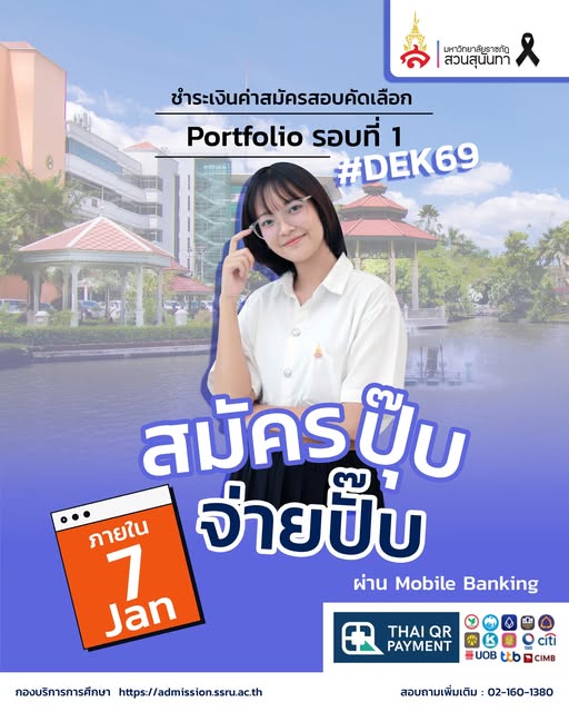 พร้อมก้าวสู่รั้วสวนสุนันทาไปด้วยกัน สมัครปุ๊บ จ่ายปั๊บ! อย่าพลาดรอบ Portfolio ภายในวันที่ 7 มกราคม 2569