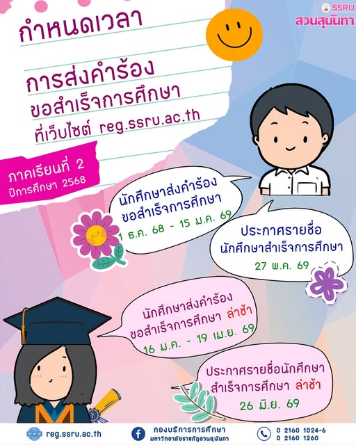 การส่งคำร้องขอสำเร็จการศึกษา ประจำภาคเรียนที่ 2 ปีการศึกษา 2568 ส่งคำร้องได้ที่ reg.ssru.ac.th