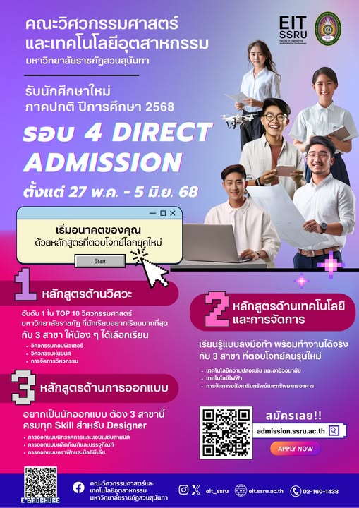 Our programs are designed to meet the demands of careers in the digital age—encompassing engineering, technology, management, and design. At the Faculty of Engineering and Industrial Technology, Suan Sunandha Rajabhat University, we go beyond theory. We focus on hands-on learning to develop both critical thinkers and skilled practitioners through real-world experience.