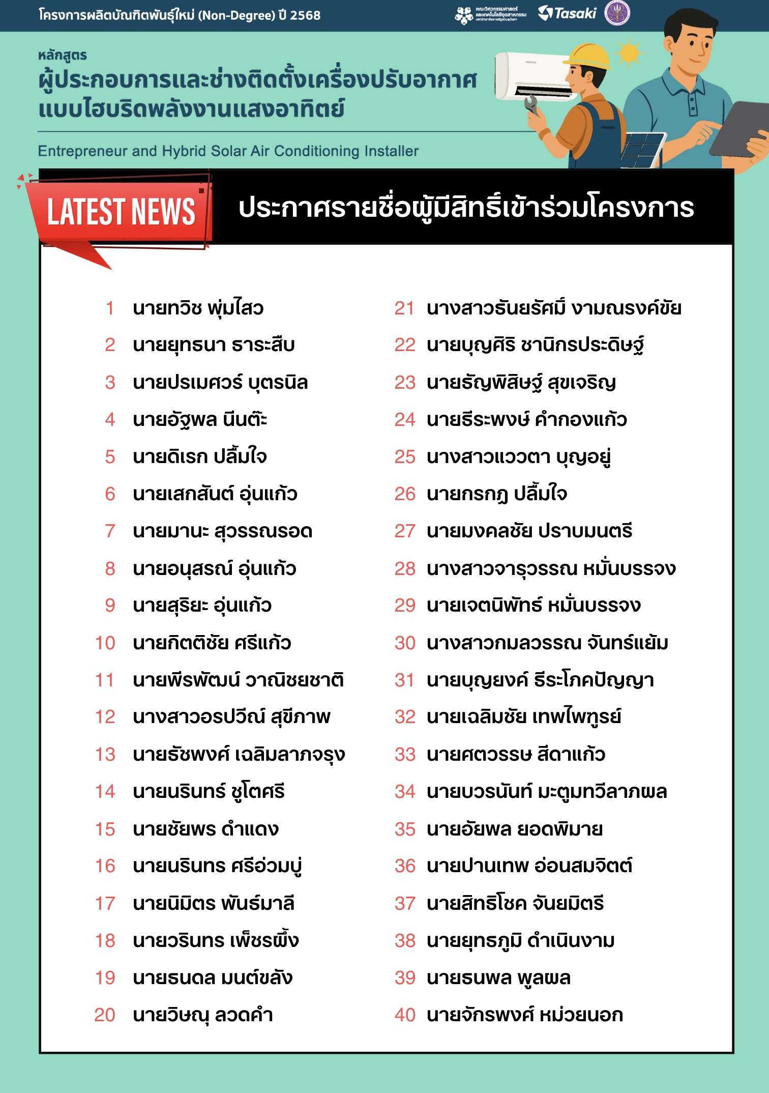 Announcement of Eligible Participants for the New Generation Graduate Program “Entrepreneurship and Hybrid Solar Air Conditioner Installation Technician Course”