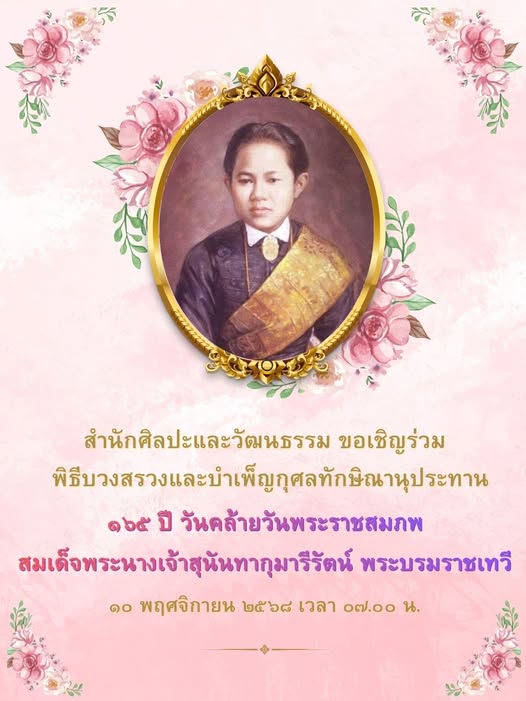 The Office of Arts and Culture cordially invites you to attend the Ceremony of Worship and Merit-Making (Thaksinanupathan) in dedication to Her Majesty Queen Sunandha Kumariratana, the Royal Consort, on Monday, November 10, 2025, at the courtyard in front of Her Majesty Queen Sunandha Kumariratana Monument and Saisuddhanaphadol Building.