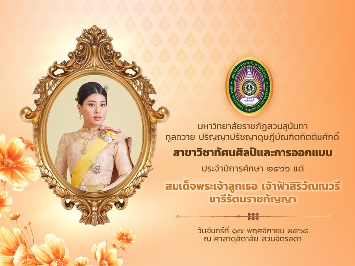 Suan Sunandha Rajabhat University presented an Honorary Doctor of Philosophy degree in Visual Arts and Design for the Academic Year 2023 to Her Royal Highness Princess Sirivannavari Nariratana Rajakanya at Sala Dusidalai, Suan Chitralada, on 17 November 2025.