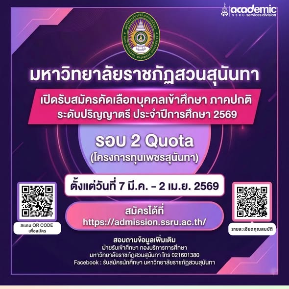 Suan Sunandha Rajabhat University is now accepting applications for new students in the regular undergraduate program for the Academic Year 2026 (B.E. 2569), Round 2: QUOTA 69 (Phet Sunantha Scholarship Program).(March 7 to April 2, 2026.)