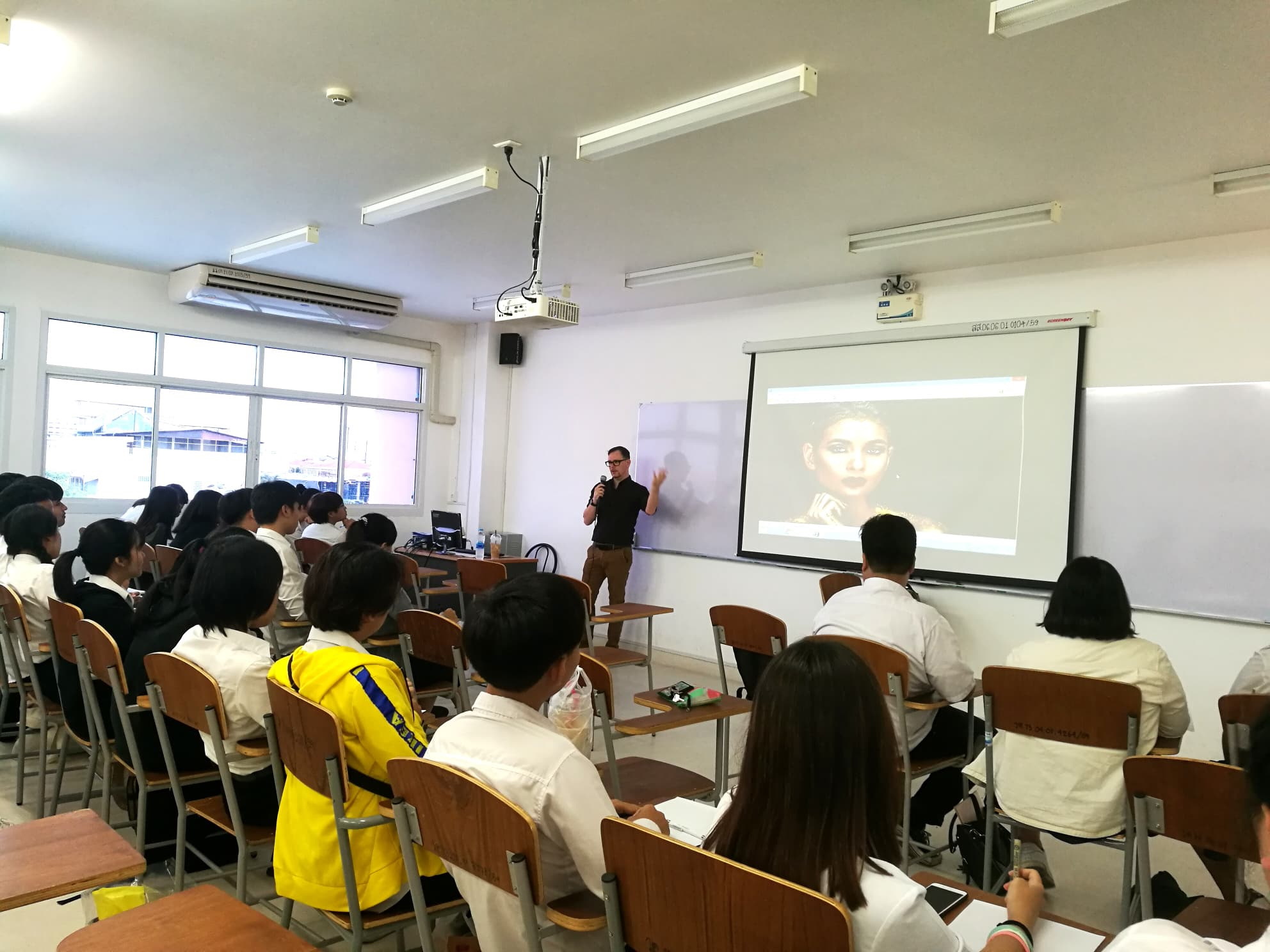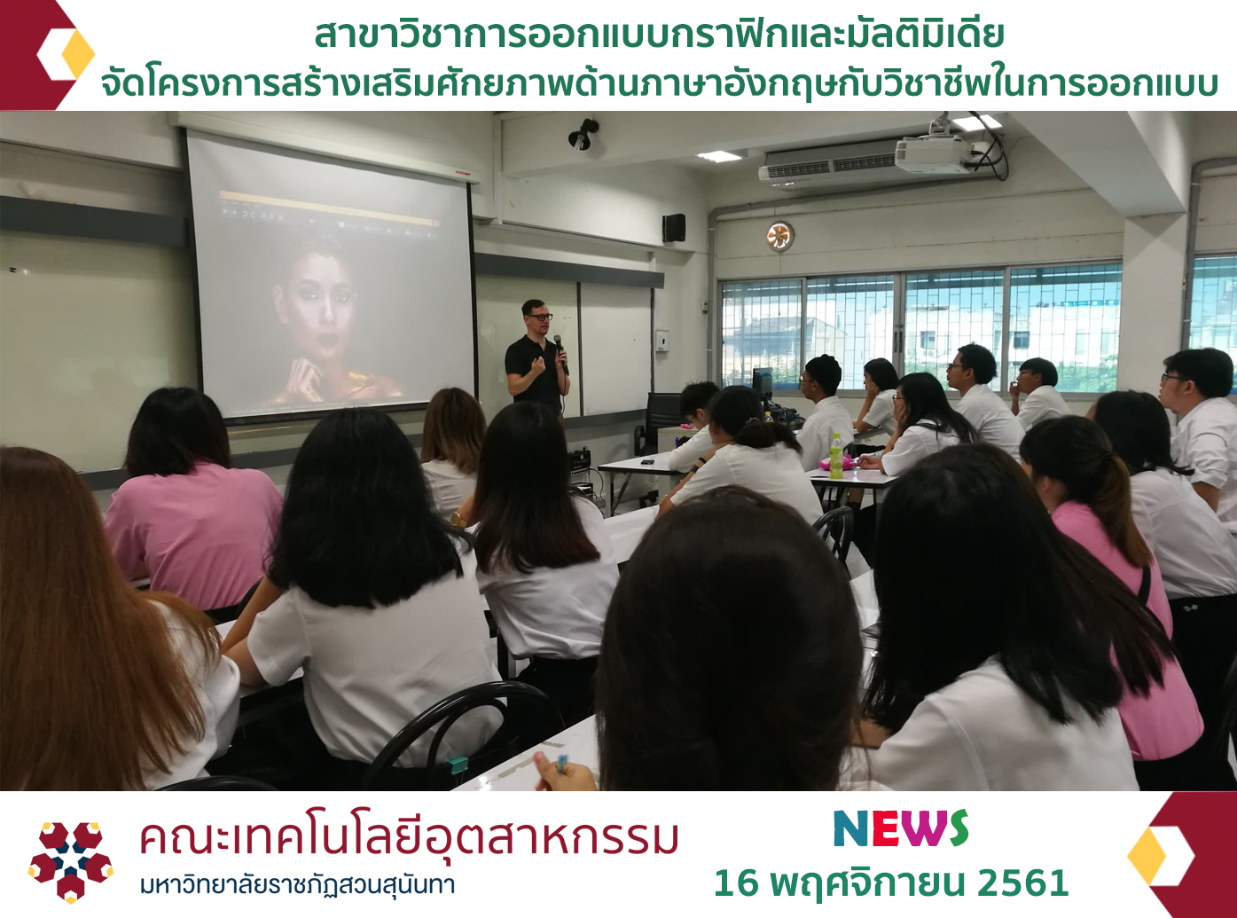 สาขาวิชาการออกแบบกราฟิกและมัลติมิเดีย จัดโครงการสร้างเสริมศักยภาพด้านภาษาอังกฤษกับวิชาชีพในการออกแบบ ให้กับนักศึกษาชั้นปีที่ 3 และชั้นปีที่ 4 มีวัตถุประสงค์เพื่อเพิ่มศักยภาพด้านภาษาอังกฤษให้กับนักศึกษาด้านการออกแบบ จากผู้เชี่ยวชาญเจ้าของภาษาในระดับสากล และเพื่อเป็นการให้นักศึกษาได้ฝึกทักษะในการพูดภาษาอังกฤษในการทำงาน โดยได้รับเกียรติจากวิทยากรรับเชิญ Mr. Eric Beaulieu บรรยายเรื่อง การนำเสนองานออกแบบภาษาอังกฤษกับวิชาชีพในการออกแบบ เมื่อวันที่ 12 และวันที่ 16 พฤศจิกายน 2561 ที่ผ่านมา