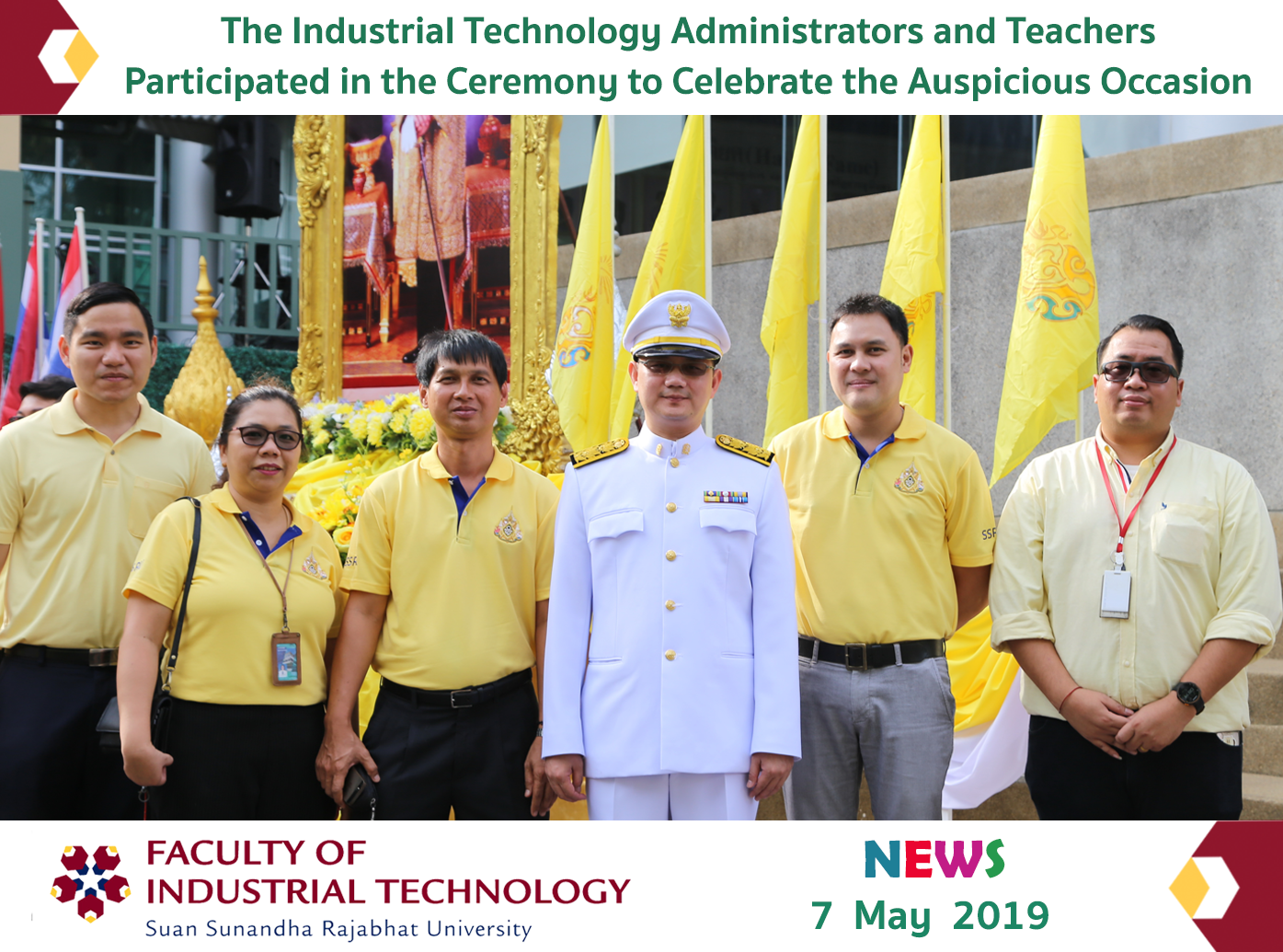 On May 7, 2019, at 08.00 a.m., the administrator as well as teachers from the Faculty of Industrial Technology led by Assistance Professor Dr. Palang Wongtanasuporn, the Dean of the Faculty of Industrial Technology, participated in the ceremony to celebrate the auspicious occasion of the marriage of His Majesty King Maha Vajiralongkorn Bodindradebaya varangkun at the ceremony area in front of the Office of the President.