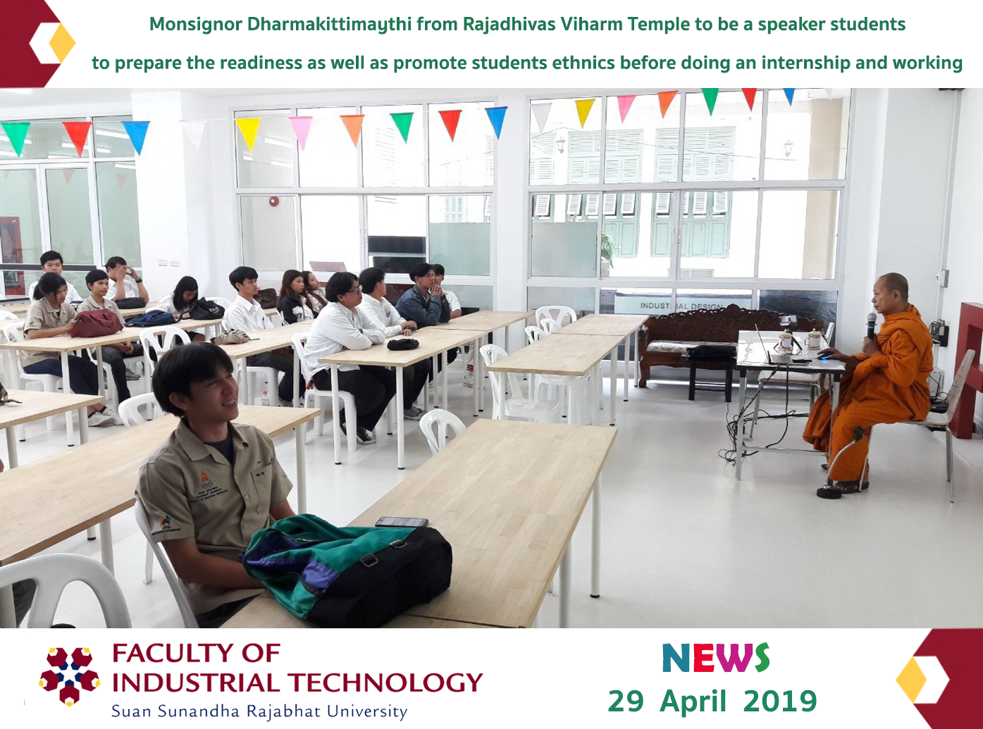 On Monday 29 April 2019, the Industrial Management Major, the Faculty of Industrial Technology, led by Dr. Sawai Siritongthaworn, the Head of Industrial Management Major, held the ethics-for-work training for the third-year Industrial Management students to prepare the readiness as well as promote students ethnics before doing an internship and working after they graduated. The training was honored by Monsignor Dharmakittimaythi from Rajadhivas Viharm Temple to be a speaker in preaching at Room 4711, the Faculty of Industrial Technology. This training benefited the students to understand and experience how to well behave in a workplace to be promoted into a labor market in the future. In addition, the training also illustrated that the dharma always presents around us.