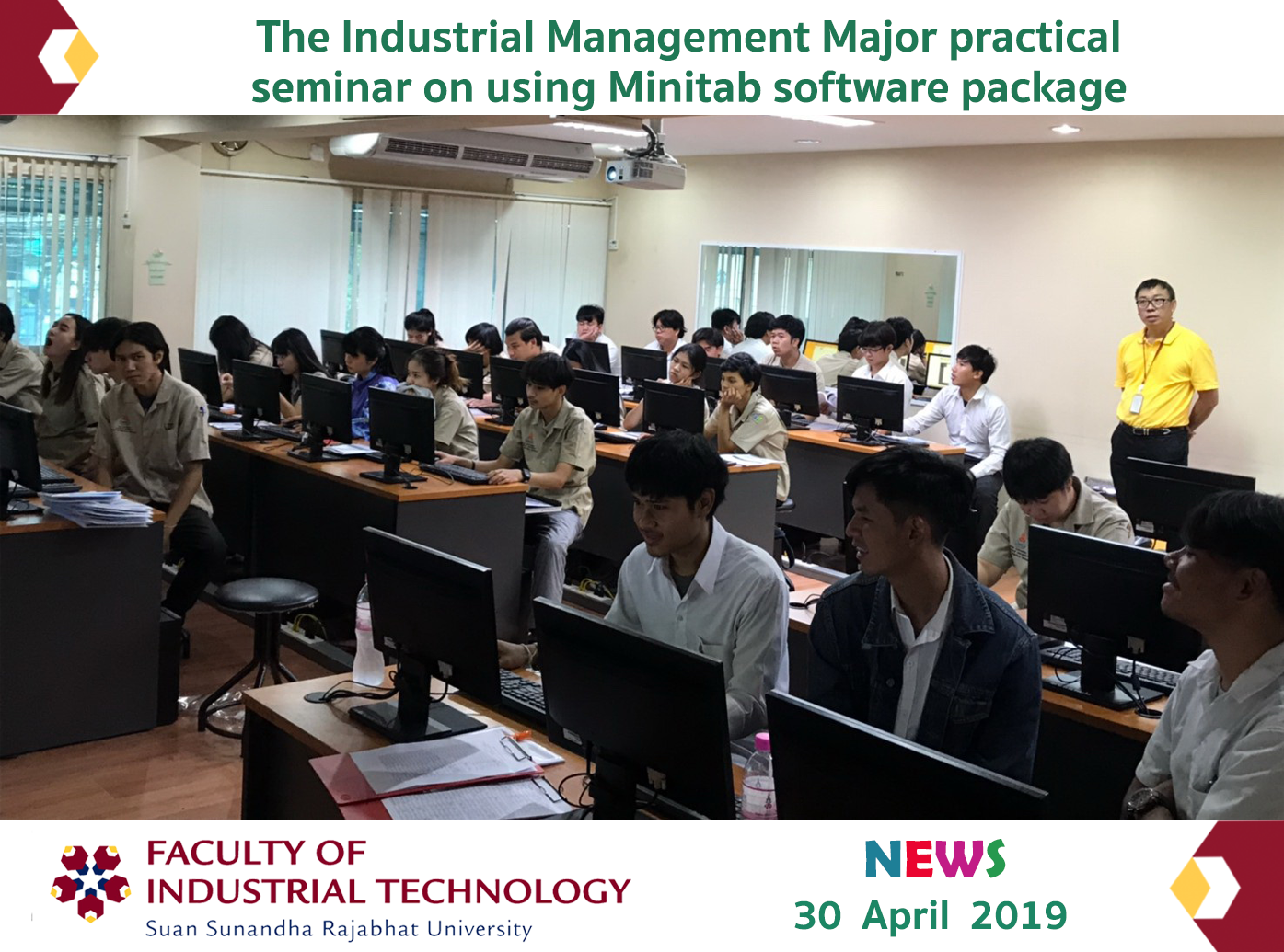 The Industrial Management Major, the Faculty of Industrial Technology, held a practical seminar on using Minitab software package for the third-year Industrial Management students on Tuesday 30 April 2019 in order to develop students’ knowledge and skills on information, media as well as technology, and to help students primarily apply the knowledge and skills into the real working situations. This practical seminar was held at Computer Lab 4222, Building 42, the Faculty of Industrial Technology, and was honored by Mr. Rattanapong Yodsrima, the Statistical Support staff form Solution Center Company Limited which is the only one Minitab software distributor in Thailand, to be a speaker.