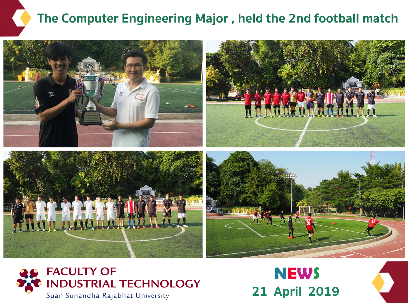 The Computer Engineering Major, the Faculty of Industrial Technology, held the 2nd football match which consisted of teacher team (white t-shirt), alumni team (red t-shirt) and current-student team (black t-shirt). The match result was that the current-student team won. On April 21 , 2019