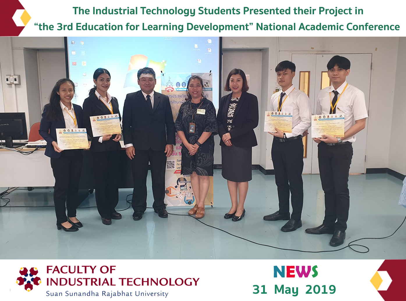 On May 31, 2019, the Facility Management students from the Faculty of Industrial Technology including Mr. Nattawut Trikesornmas, Miss Lerdwilai Pormket, Mr. Thanapol Limkaiseang as well as Mr. Nattapan Kachchaphong participated in presenting their project in “the 3rd Education for Learning Development” National Academic Conference 2019 in a field of Sciences, Technologies, Inventions and Innovations at the Faculty of Education, Suan Sunandha Rajabhat University.