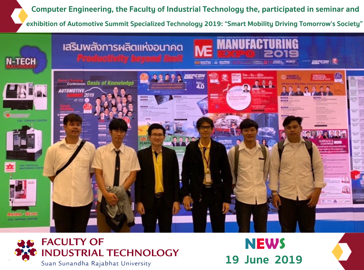 On June 19, 2019, Mr. Sethakarn Prongnuch, Head of Computer Engineering Department, Mr. Narong Narongrat, the Head of Electrical Technology Department as well as students majoring Computer Engineering, the Faculty of Industrial Technology the, participated in seminar and exhibition of Automotive Summit Specialized Technology 2019: “Smart Mobility Driving Tomorrow’s Society” in the Manufacturing Expo 2019 held by Automotive Institute and Reed Tradex Company Limited at Bangkok International Trade and Exhibition Center.