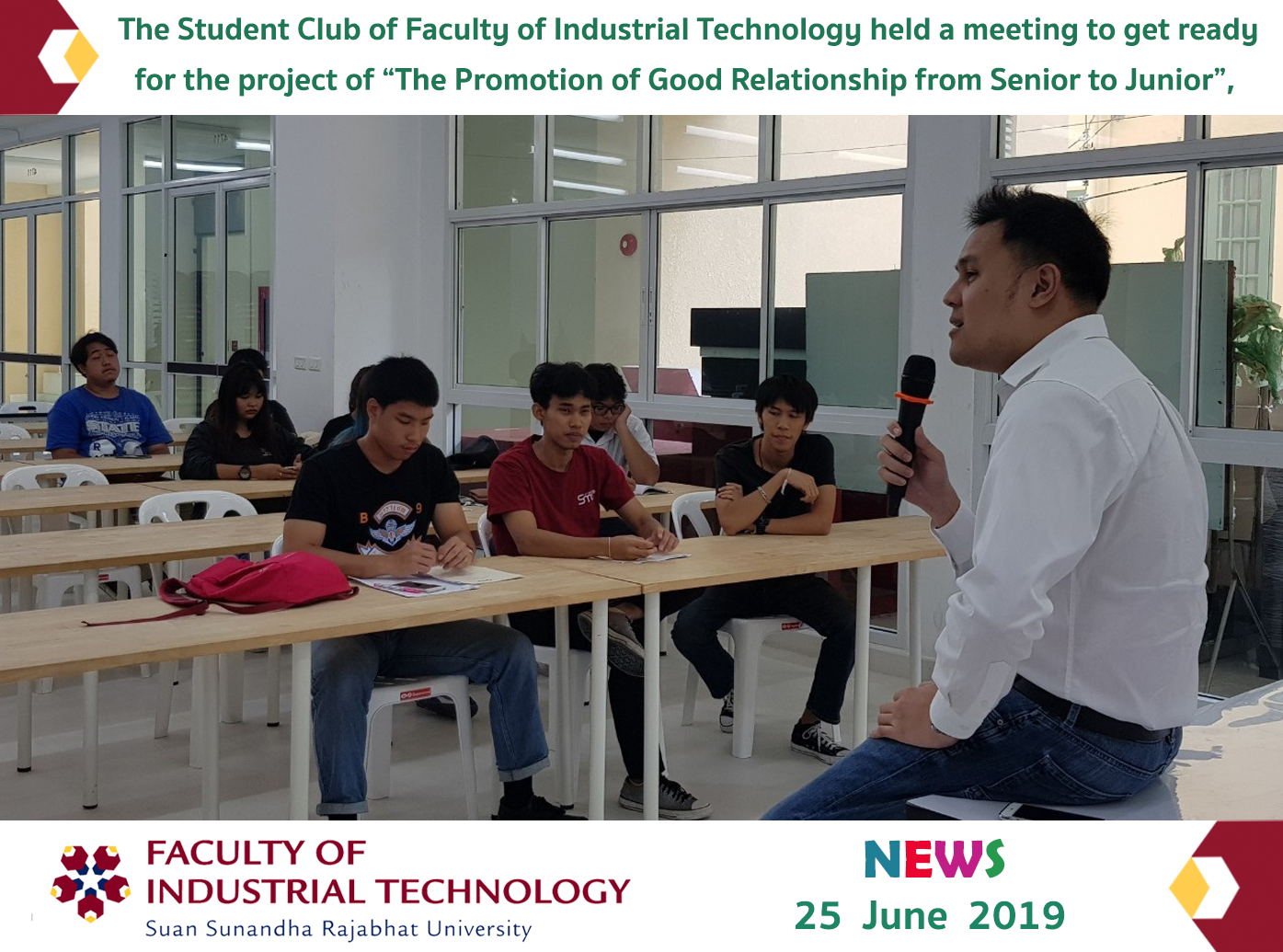 On June 25, 2019, the Student Club of Faculty of Industrial Technology held a meeting to get ready for the project of “The Promotion of Good Relationship from Senior to Junior”, and Mr. Sahapop Gleblumjeak, the Vice Dean for Student Affairs, participated in listening to students’ opinions.