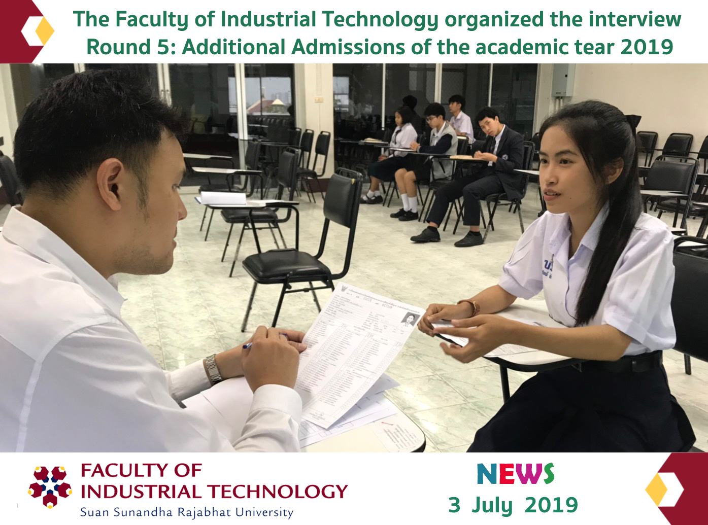 On July 3, 2019, the Faculty of Industrial Technology organized the interview for selecting undergraduate students in the regular program (Round 5: Additional Admissions) of the academic tear 2019 at Building 42, the Faculty of Industrial Technology.