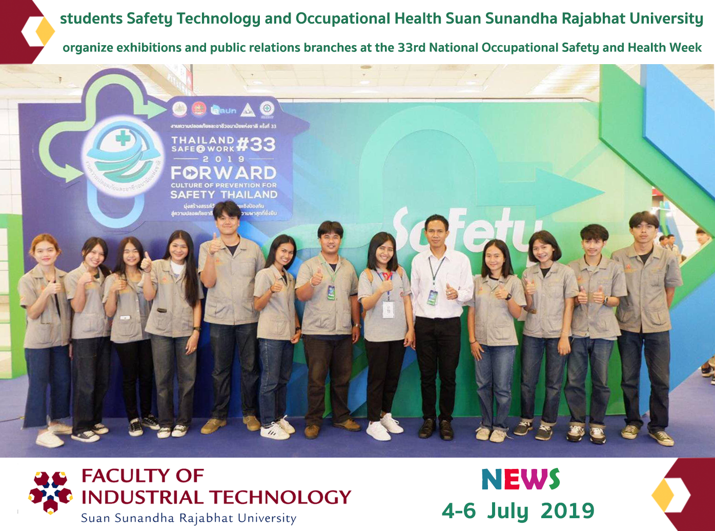 4th year students Safety Technology and Occupational Health Suan Sunandha Rajabhat University organize exhibitions and public relations branches at the 33rd National Occupational Safety and Health Week (Thailand Safe @ Work # 33 2019) on 4-6 July 2019 booth D2 hall EH 101-102 at Bangkok International Trade and Exhibition Center, Bangna, Bangkok