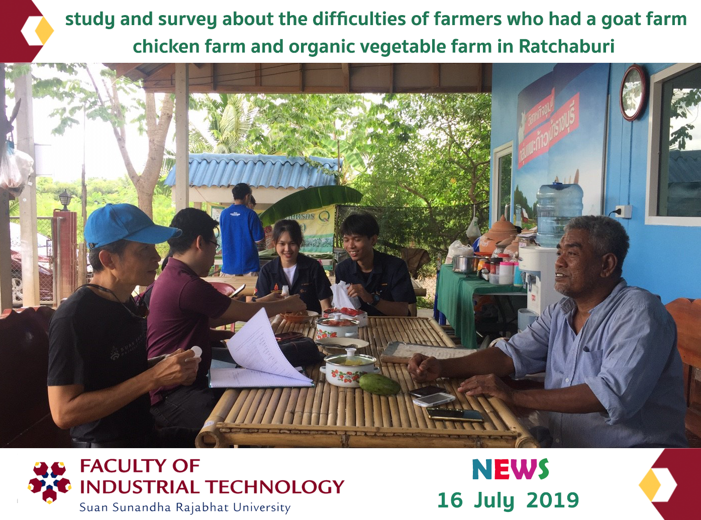 On July 16, 2019, Mr. Sethakarn Prongnuch, the Head of Computer Engineering Department and Assistance Professor Dr. Athisamai Sophan, Head of Industrial Electrical Technology Branch, the Faculty of Industrial Technology, as well as the fourth-year Computer Engineering students went on the field trip to observe, study and survey about the difficulties of farmers who had a goat farm, chicken farm and organic vegetable farm in Ratchaburi Province in order to apply the technology of smart farm, internet of things and robotics into helping farmers in solving their problems.