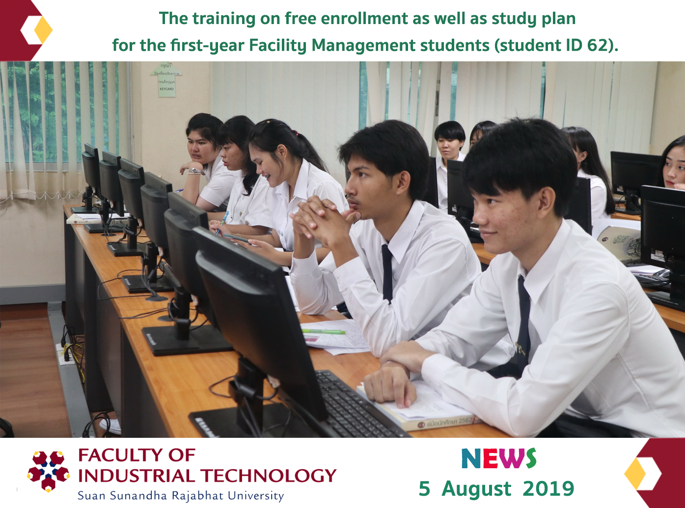 On August 6, 2019, the Education Services Department, the Faculty of Industrial Technology, organized the training on free enrollment as well as study plan for the first-year Facility Management students (student ID 62). at Room 4222, Building 42, the Faculty of Industrial Technology.