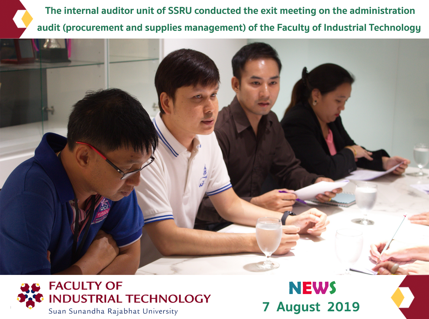 On August 17, 2019, the internal auditor unit of Suan Sunandha Rajabhat University conducted the exit meeting on the administration audit (procurement and supplies management) of the Faculty of Industrial Technology in order to report the audit results. In this meeting, teacher Picha Sriprachan, the Vice Dean for Administration, and Dr. Chonmapat Torasa, the Vice Dean for Academic Affairs, as well as Miss Chayapa Jamsai, the Head of the Dean's Office, and personnel involving procurement and supplies of the Faculty of Industrial Technology welcomed at the guest room Living Space By SBDS, Building 42