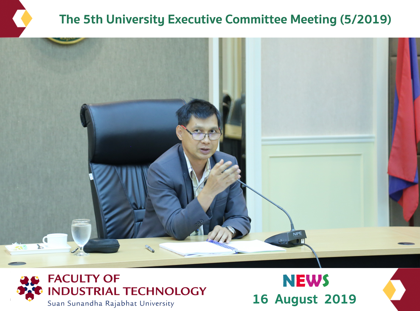 On August 16, 2019, at 1.00 p.m., the Faculty of Industrial Technology, Suan Sunandha Rajabhat University, held the 5th university executive committee meeting (5/2019) at Pissamai Phimonsat Meeting Room, Building 43, and Assistant Professor Dr. Palang Wongtanasuporn, the Dean of the Faculty of Industrial Technology, asked Dr. Chonmapat Torasa, the Vice Dean for Academic Affairs, to preside over the meeting. Additionally, the administrators, qualified committees as well as the head of the Office of the Dean of the Faculty of Industrial Technology also participated in the meeting. The proposed agendas included the consideration (draft) of the establishment of an innovation and design service center in the Faculty of Industrial Technology, Suan Sunandha Rajabhat University, the consideration of the result of the internal quality assurance assessment in the program level of the academic year 2018, and the consideration (draft) of the action plan of the fiscal year 2020 of the Faculty of Industrial Technology.