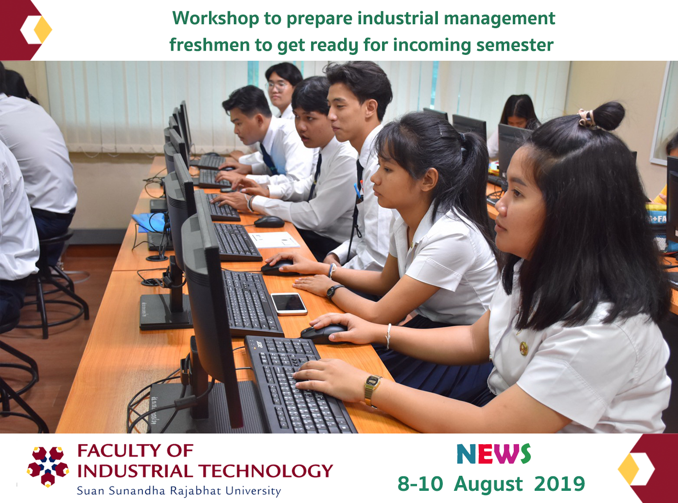 On 8-10 August 2019, the Department of Industrial Management, the Faculty of Industrial Technology, Suan Sunandha Rajabhat University, organized a workshop to prepare industrial management freshmen to get ready for incoming semester at Room 4222 and 4711, the Faculty of Industrial Technology. The workshop consisted of activities in developing fundamental mathematic skills for industrial management and fundamental Excel software. In addition, there was an orientation for freshmen by cooperating with parents. The aims of the workshop included 1) to prepare freshmen learning and living in a campus, 2) to develop parents understanding and cooperation with them in caring for their children, and 3) to prepare freshmen skills of numerical calculation and information technology, especially basic Excel programs.