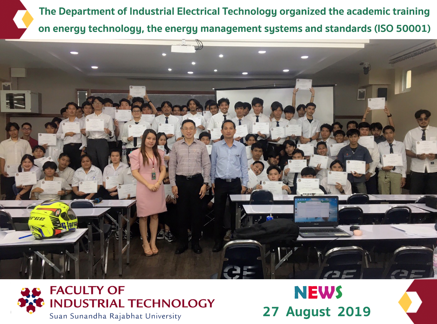 On August 27, 2019, the Department of Industrial Electrical Technology organized the academic training on energy technology, the energy management systems and standards (ISO 50001), for the third-year and fourth-year students in the Branch of Energy Technology as well as the fourth-year students in the Branch of Electrical Technology. The aims of this training were to provide students the knowledge on electrical energy management, energy technology, energy planning and policy as well as energy management systems and standards. In addition, this training was honored by Mr. Wasan Sinsuwan, the Energy Consultant of Energy Quality Service Co., Ltd., to be a guest speaker at Room 4701, Building 47, the Faculty of Industrial Technology.