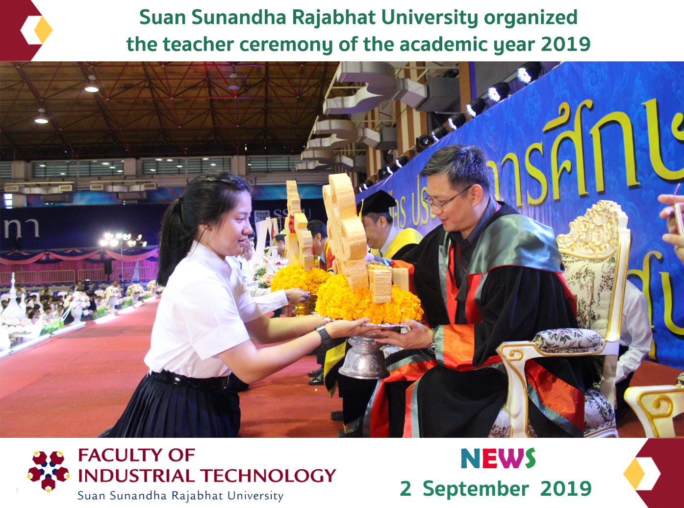 On August 29, 2019, at 10.30 a.m., Suan Sunandha Rajabhat University organized the teacher ceremony of the academic year 2019. In this event, Assistance Professor Dr. Chananart Meenanan, the Vice President for Student Affairs, presided over the ceremony. In addition, administrators, teachers as well as first-year students in the Faculty of Industrial Technology also participated in the ceremony. Suan Sunandha Rajabhat University annually organizes the teacher ceremony to remind of the kindness and sacrifice of teachers who instruct their students. Besides, it is for the prosperity of the freshmen as well as the pride of being Rajabhat University..