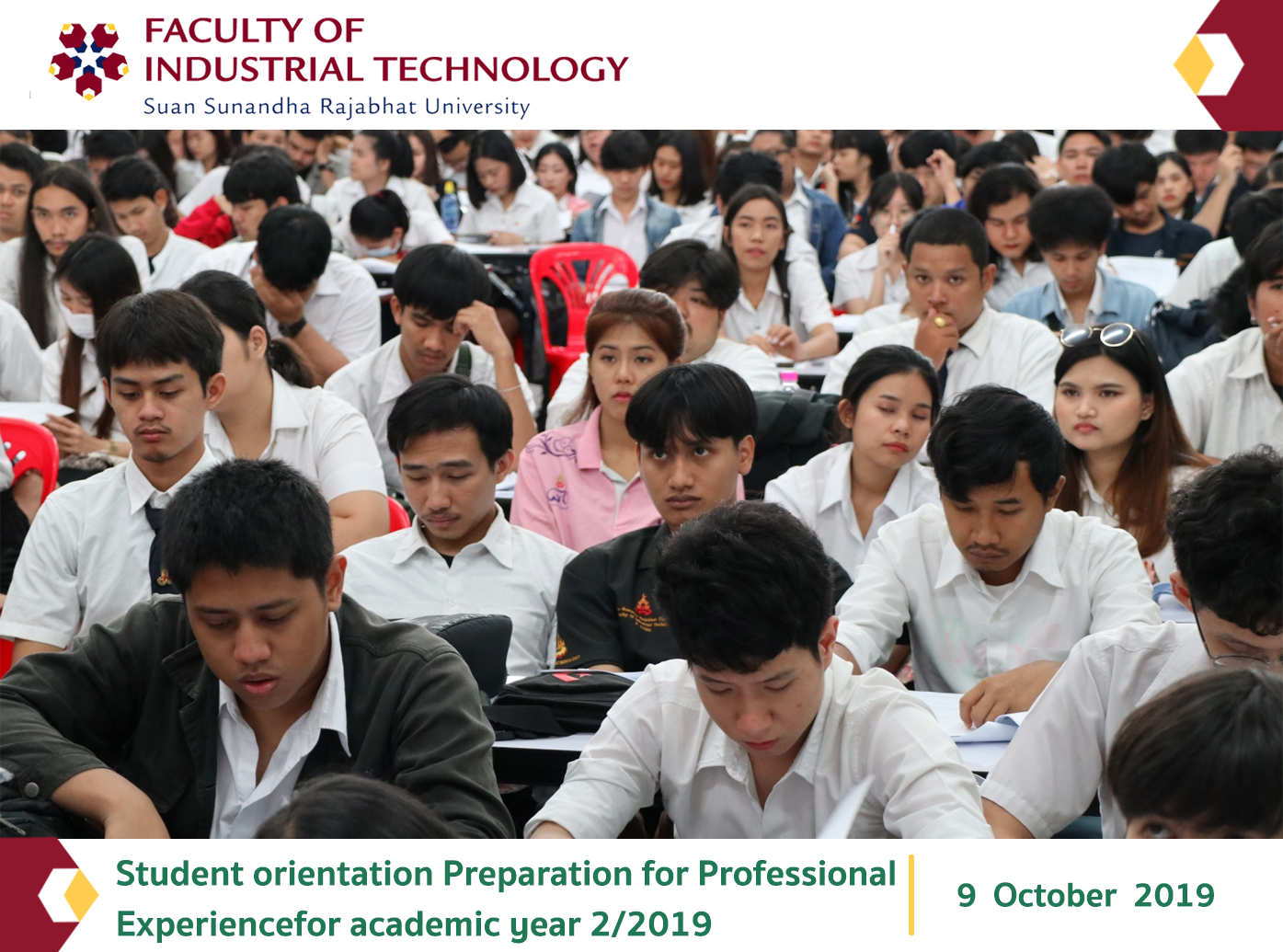On Wednesday 9 October 2019, the Educational Services Division, together with the Division of Student Affairs and Arts and Culture Faculty of Industrial Technology Organized the 4th year student experience training orientation program for academic year 2/2019 with the objective to make students aware of the importance of the internship. Preparation before internship Practice during the internship Practice after the internship And clarifying documents related to professional experience training at room 4701, Building 47, Faculty of Industrial Technology Suan Sunandha Rajabhat University
