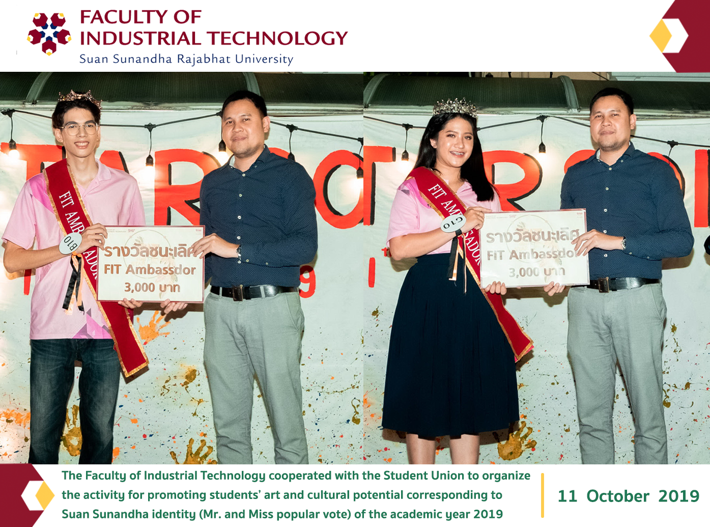 The Faculty of Industrial Technology cooperated with the Student Union to organize the activity for promoting students’ art and cultural potential corresponding to Suan Sunandha identity (Mr. and Miss popular vote) of the academic year 2019