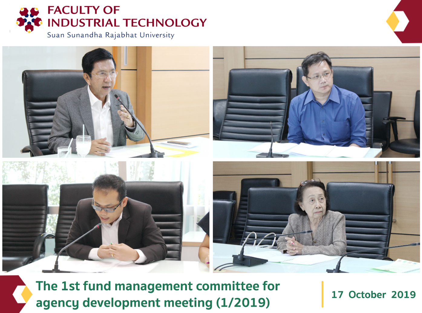 On October 17, 2019, at 11.30 a.m., Assistant Professor Dr. Palang Wongtanasuporn, the Dean of the Faculty of Industrial Technology, participated in the 1st fund management committee for agency development meeting (1/2019) at Office of the President Meeting Room, and Associate Professor Dr. luedech Girdwichai, the President of Suan Sunandha Rajabhat University, presided over the meeting.