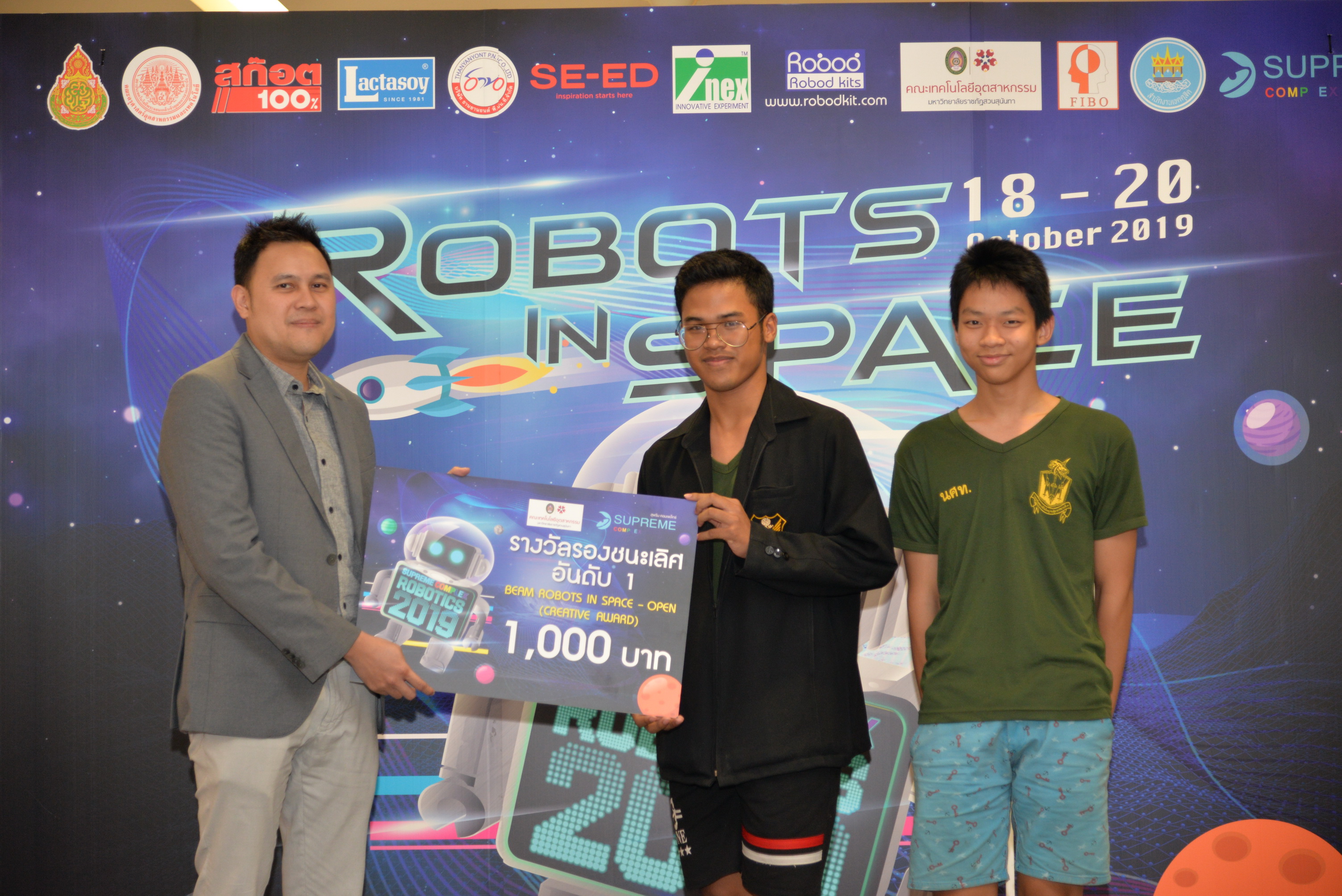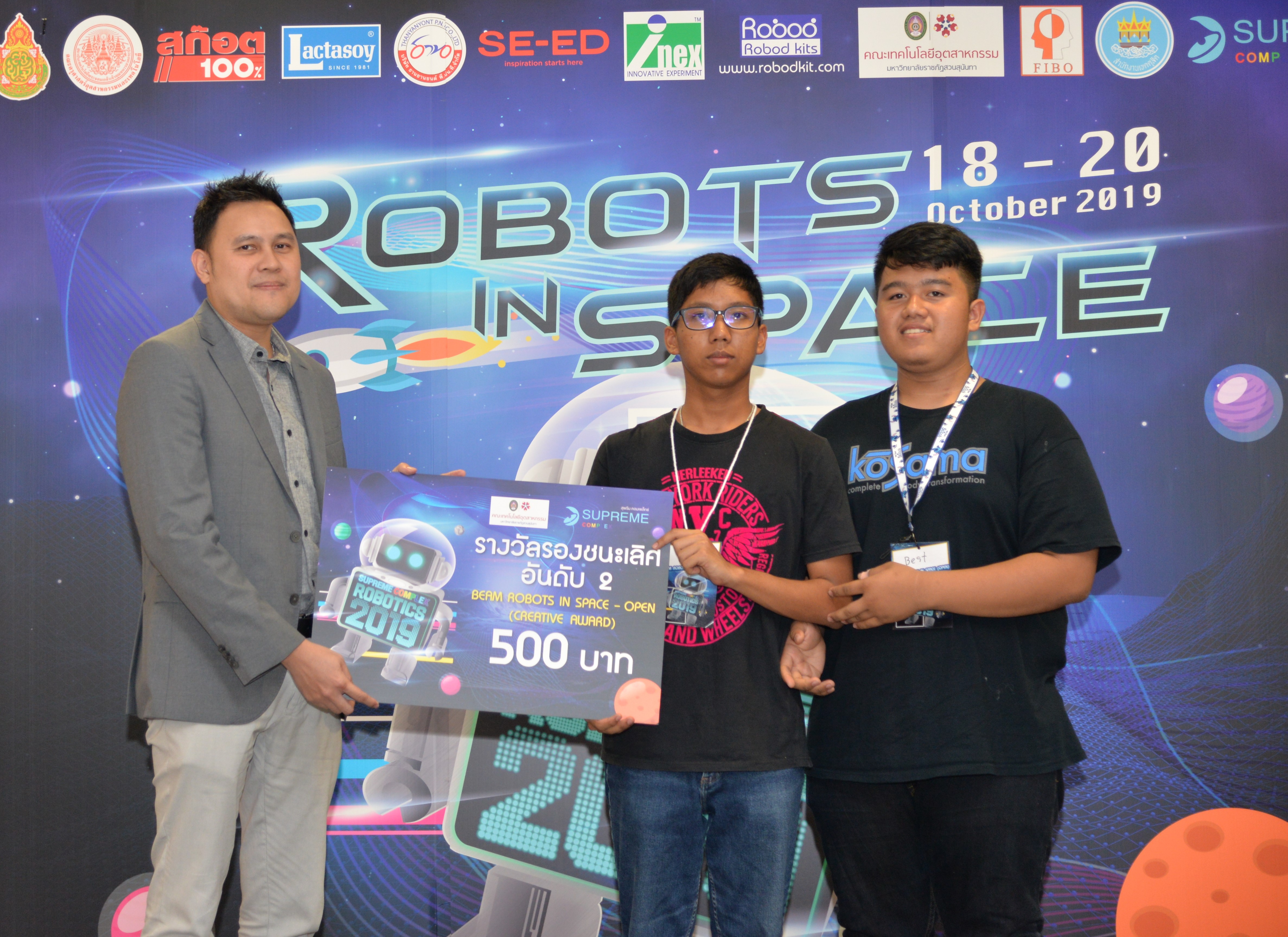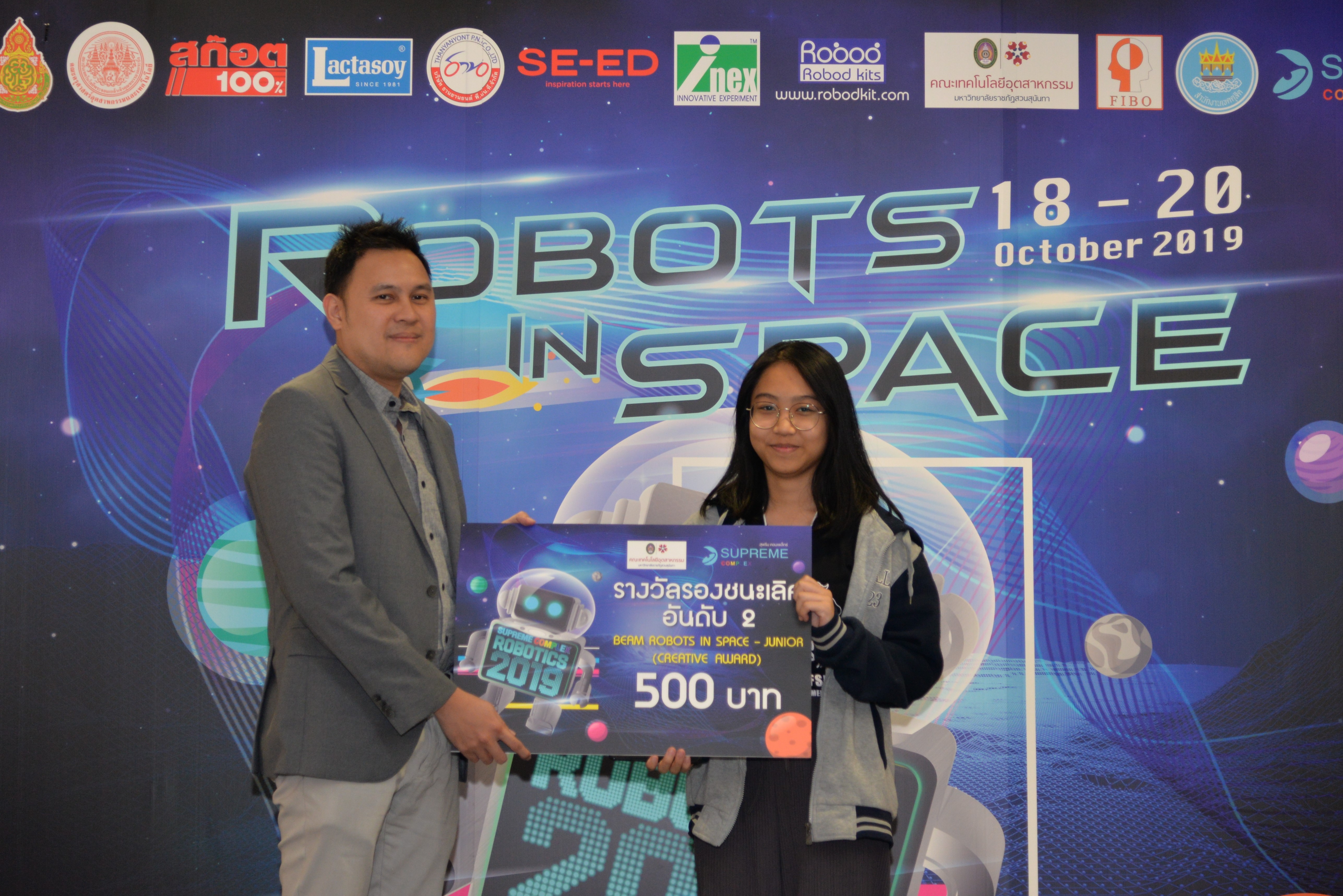 The robot contest “SUPREME COMPLEX ROBOTICS 2019” of the academic year 2019 was organized continuously until the 7th year under the name “ROBOTS IN SPACE” during 18-20 October 2019 by Supreme Complex Shopping Mall cooperating with Office of the Basic Education Commission (OBEC) and Faculty of Industrial Education and Technology, King Mongkut's Institute of Technology Ladkrabang. The winner would receive 100,000 Baht scholarship as well as receiving trophy and certificate. This contest aimed to provide students at the basic education level an opportunity to design and create their robots by integrating knowledge of science and technology to be able to function according to the given conditions effectively. In addition, it was also an activity in supporting, promoting as well as urging teachers and students to implement scientific and technological skills affecting everyday life effectually.