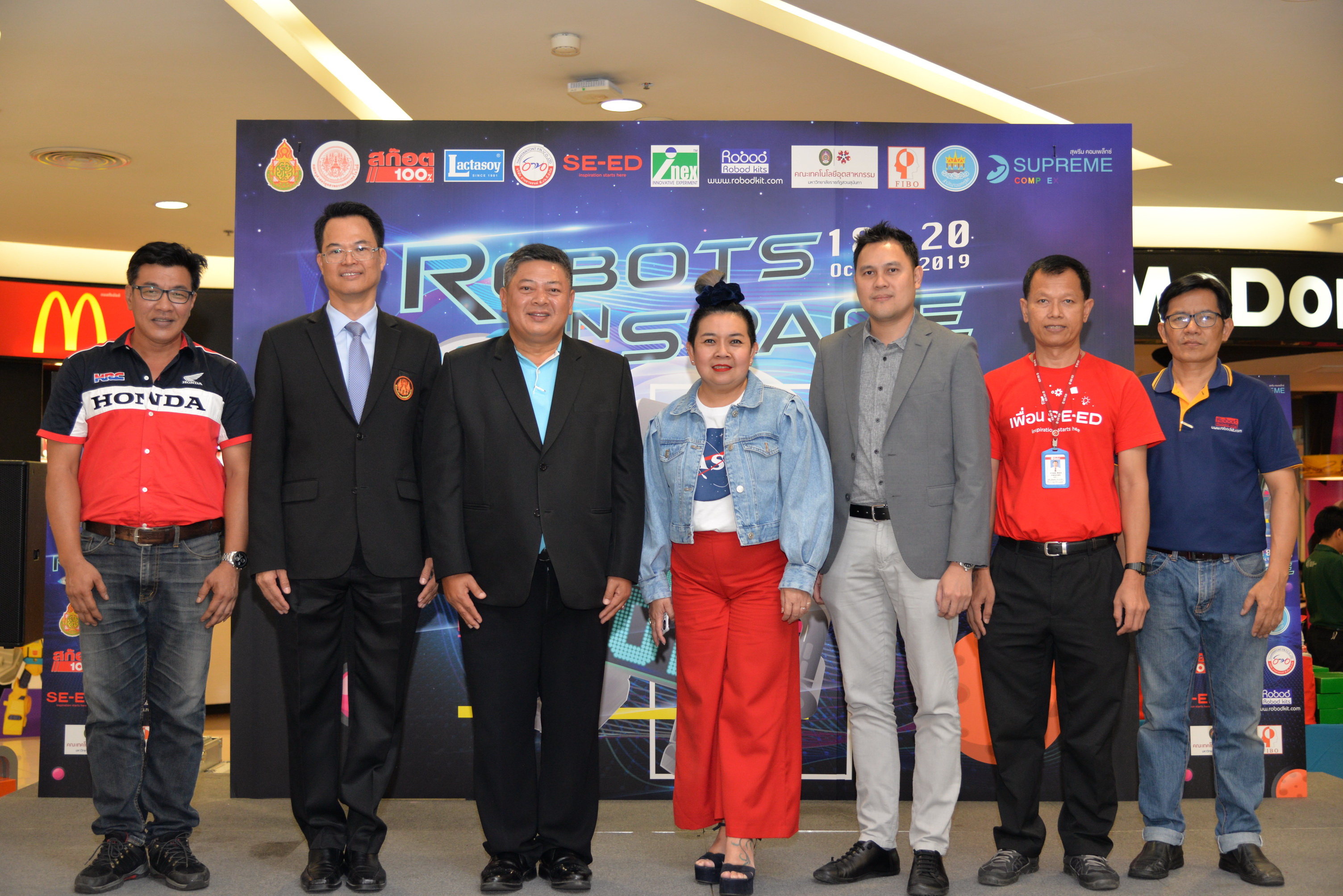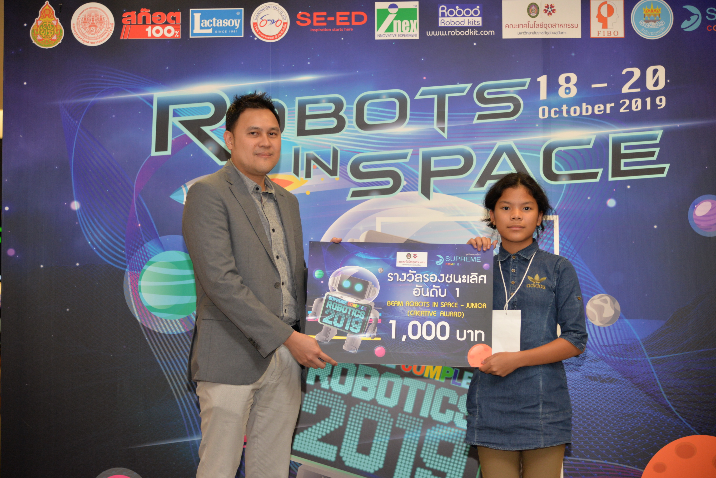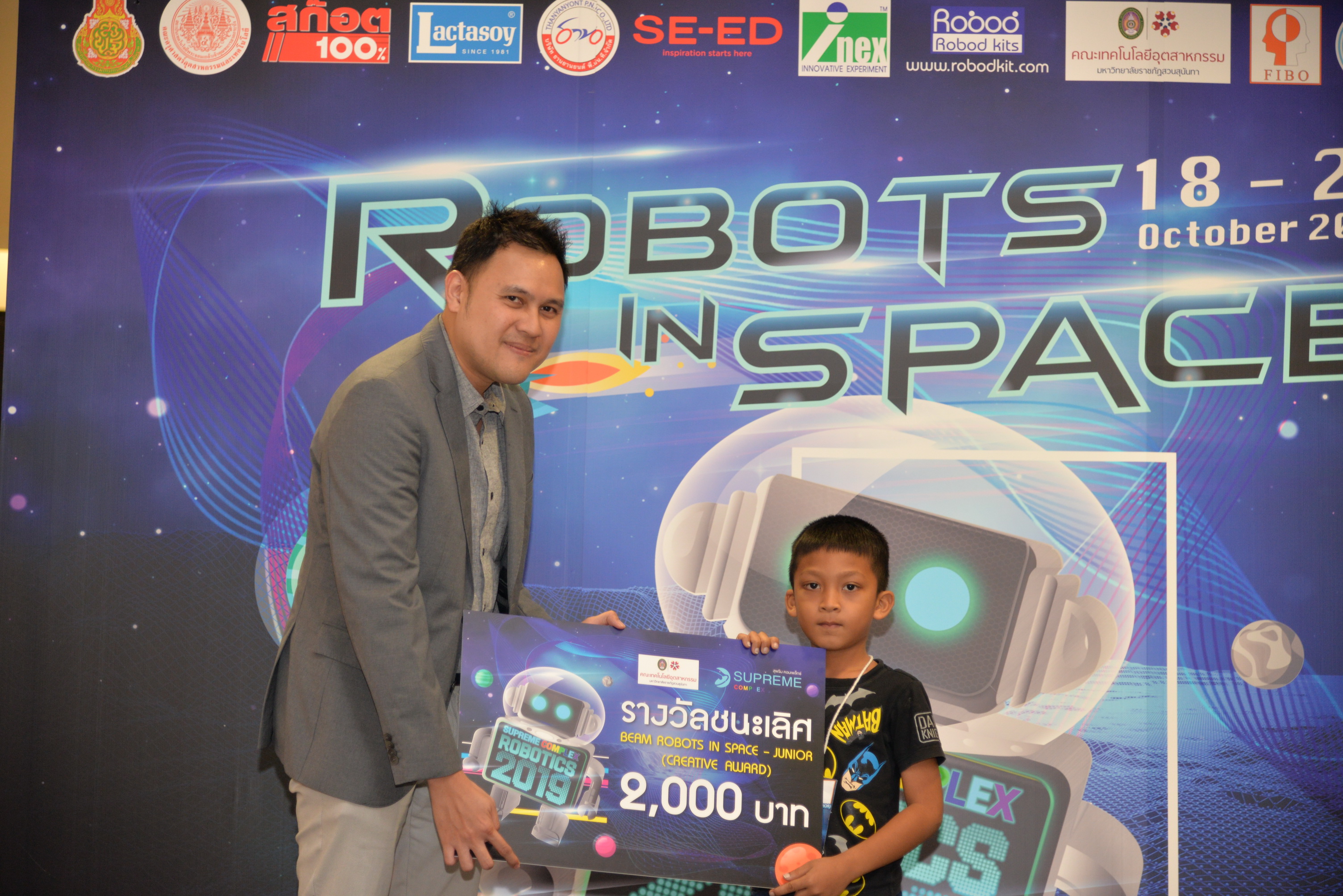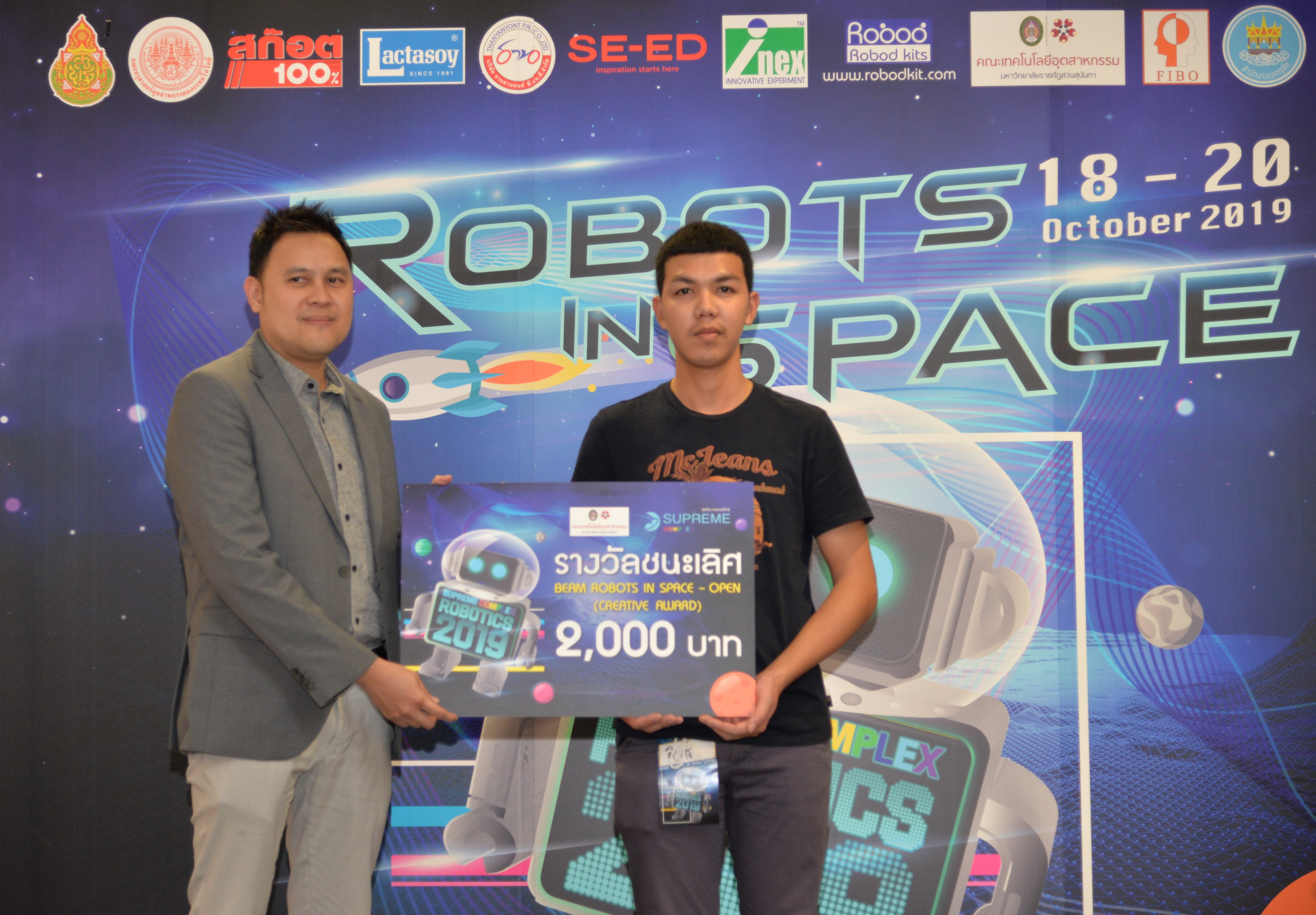 The robot contest “SUPREME COMPLEX ROBOTICS 2019” of the academic year 2019 was organized continuously until the 7th year under the name “ROBOTS IN SPACE” during 18-20 October 2019 by Supreme Complex Shopping Mall cooperating with Office of the Basic Education Commission (OBEC) and Faculty of Industrial Education and Technology, King Mongkut's Institute of Technology Ladkrabang. The winner would receive 100,000 Baht scholarship as well as receiving trophy and certificate. This contest aimed to provide students at the basic education level an opportunity to design and create their robots by integrating knowledge of science and technology to be able to function according to the given conditions effectively. In addition, it was also an activity in supporting, promoting as well as urging teachers and students to implement scientific and technological skills affecting everyday life effectually.