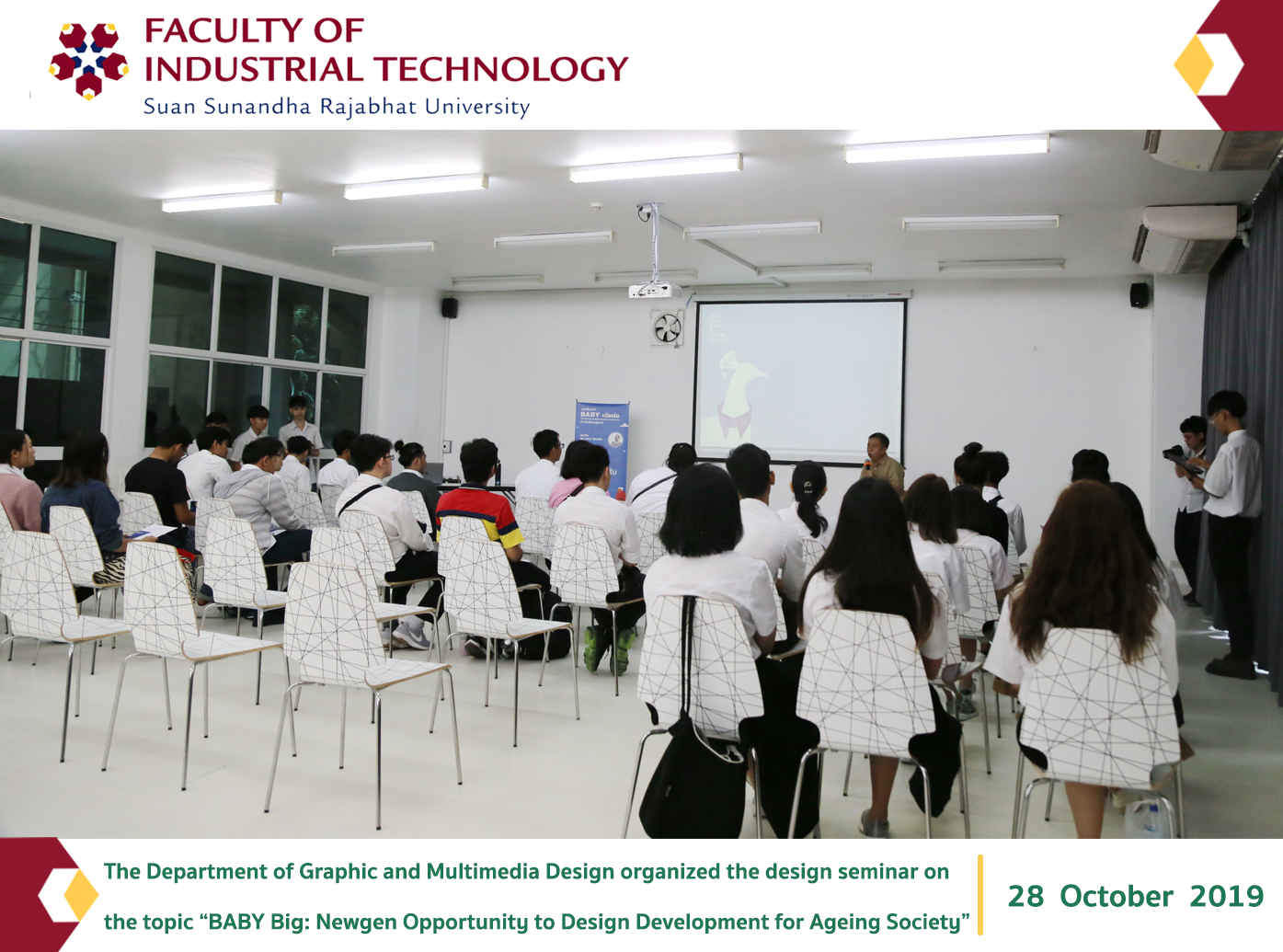 The Department of Graphic and Multimedia Design, the Faculty of Industrial Technology, organized the design seminar on the topic “BABY Big: Newgen Opportunity to Design Development for Ageing Society” at Room 4711, Building 47 on October 28, 2019, in order to stimulate and promote the design development for handling ageing society condition, and the seminar was honored by Mr. Siam Attariya, Pink Blue Black & Orange Co., Ltd., to be a speaker.