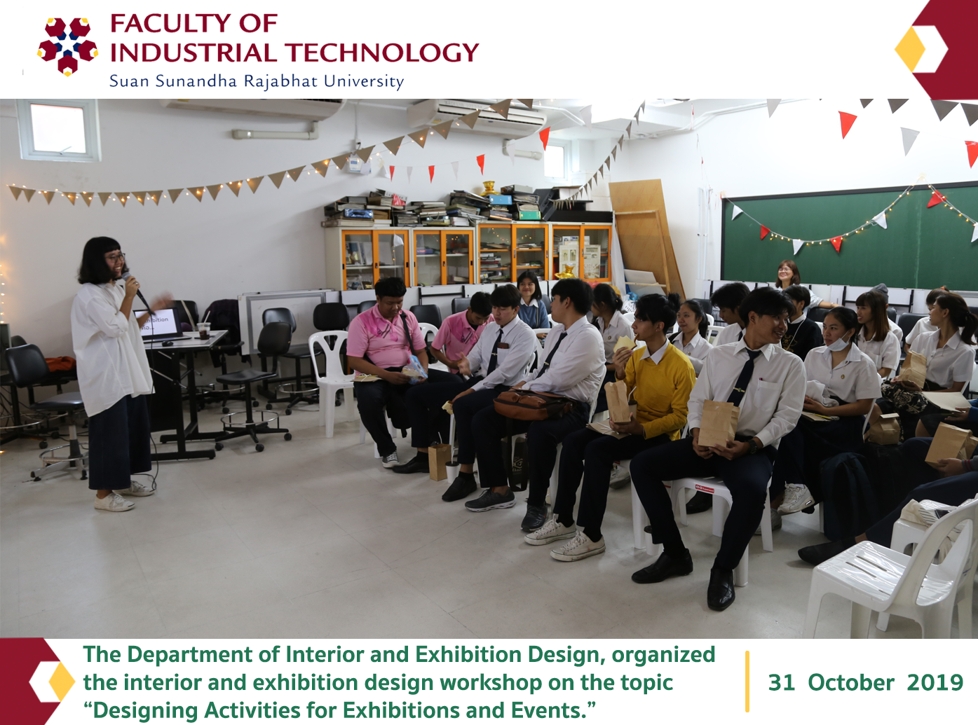Today (31 October 2019), the Department of Interior and Exhibition Design, the Faculty of Industrial Technology, organized the interior and exhibition design workshop on the topic “Designing Activities for Exhibitions and Events.” At Room 4706 in order to provide students practicing organizing seminar as well as brainstorming ideas between students and the professionals, and this workshop was honored by Sawanya Wongeiam, the Assistant Manager of Husband and Wife Company Limited to be a speaker.