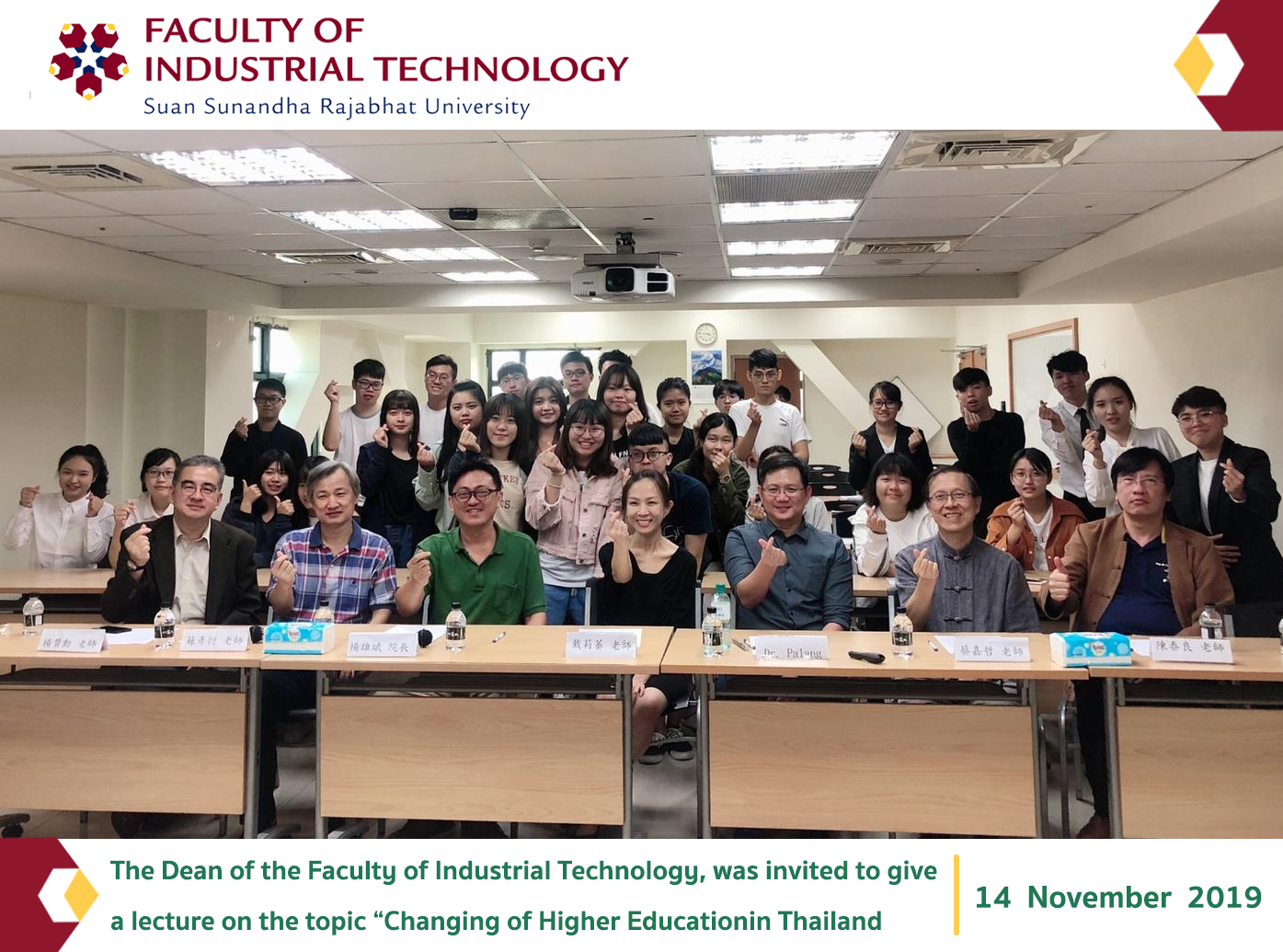 On November 14, 2019, Assistant Professor Dr. Palang Wongtanasuporn, the Dean of the Faculty of Industrial Technology, was invited to give a lecture on the topic “Changing of Higher Education in Thailand: Crisis, Disrupted and Reorganization” at Wenzao Ursuline University of Languages, Kaohsiung City, Taiwan. In this event, Assistant Professor Dr. Palang Wongtanasuporn, the Dean of the Faculty of Industrial Technology, as well as the representatives of Suan Sunandha Rajabhat University were also invited to observe teaching and learning in Digital Media Laboratory in Collage of Cultural and Educational Innovation, and discuss about guidelines for academic cooperation with the dean, Professor Shiueng-Bin Yang and the executive Team in order to investigate the possibility in cooperating in research to organize the international conference as well as exchange students.