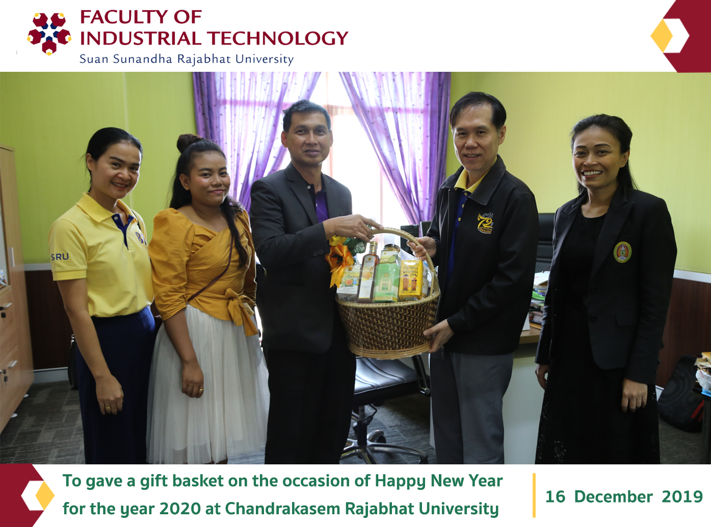On December 16, 2019, the Faculty of Industrial Technology led by Dr. Chonmapat Torasa, the Vice Dean for Academic Affairs, as well as personnel in Educational Services Section visited Assistant Professor Dr. Chalermkiat Dulsamphan, Vice President for Education Quality Assurance and Academic Services of Chandrakasem Rajabhat University and the Chairman of Rajabhat University Internal Quality Assurance Board, to gave a gift basket on the occasion of Happy New Year for the year 2020 at Chandrakasem Rajabhat University.