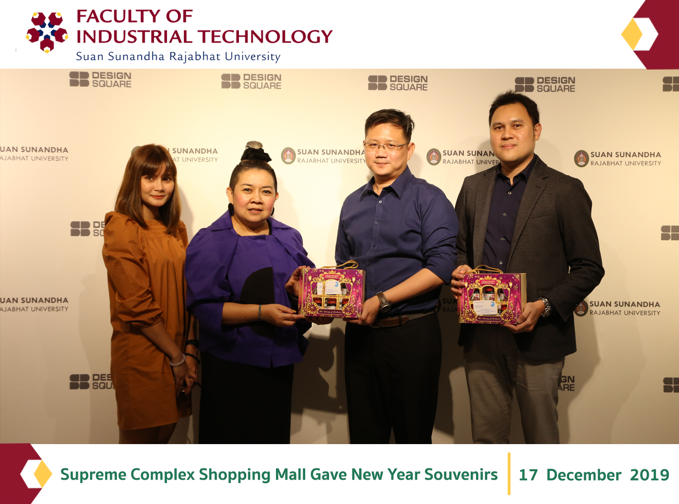 On December 17, 2019, Assistance Professor Dr. Palang Wongtanasuporn, the Dean of the Faculty of Industrial Technology, as well as Mr. Sahapop Gleblumjeak, the Vice Dean for Student Affairs, received the souvenirs from Ms. Sasilak Podjananon, the Marketing Manager of Supreme Complex Shopping Mall, on the occasion of the new year at Building 42, Living Space By SBDS.