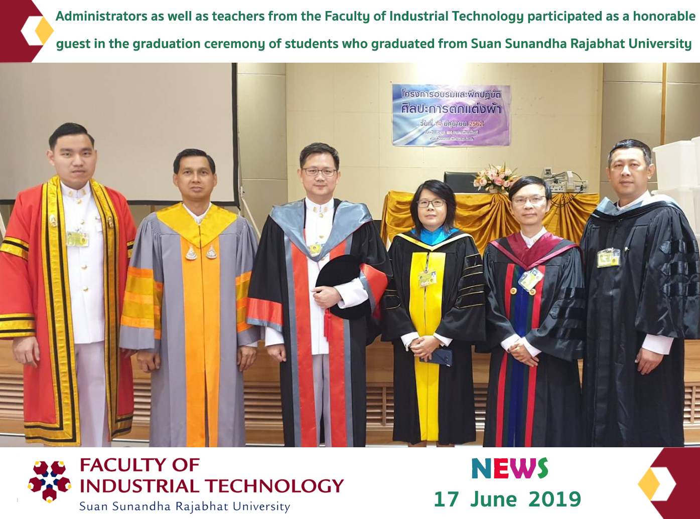 On June 17, 2019, administrators as well as teachers from the Faculty of Industrial Technology participated as a honorable guest in the graduation ceremony of students who graduated from Suan Sunandha Rajabhat University of the academic year 2016-2017 at Anek Nithat Building, Sukhothai Thammathirat Open University