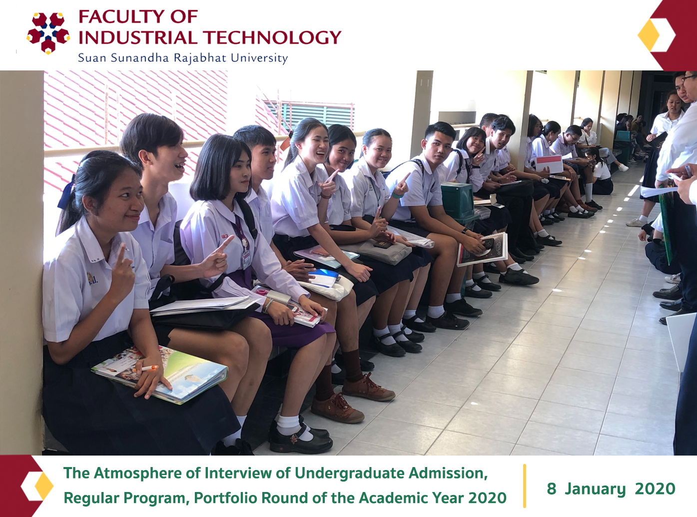 On January 8, 2020, the Faculty of Industrial Technology organized an interview for undergraduate admission, regular program, Portfolio round of the academic year 2020 at the Building of the Faculty of Industrial Technology, Suan Sunandha Rajabhat University.