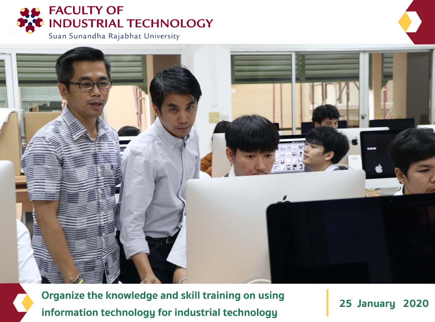 On January 25, 2020, at 09.00 a.m. – 4.00 p.m., the Division of Student Affairs and Art and Culture, the Faculty of Industrial Technology, announced to organize the knowledge and skill training on using information technology for industrial technology students for the 1st-3rd year students who were interested in the use of information technology. This training consisted including Adobe Lightroom for Photography at the Computer Laboratory, the Faculty of Industrial Technology. In addition, the keynote 3 speakers from the Idesign School Ratchathewi including: