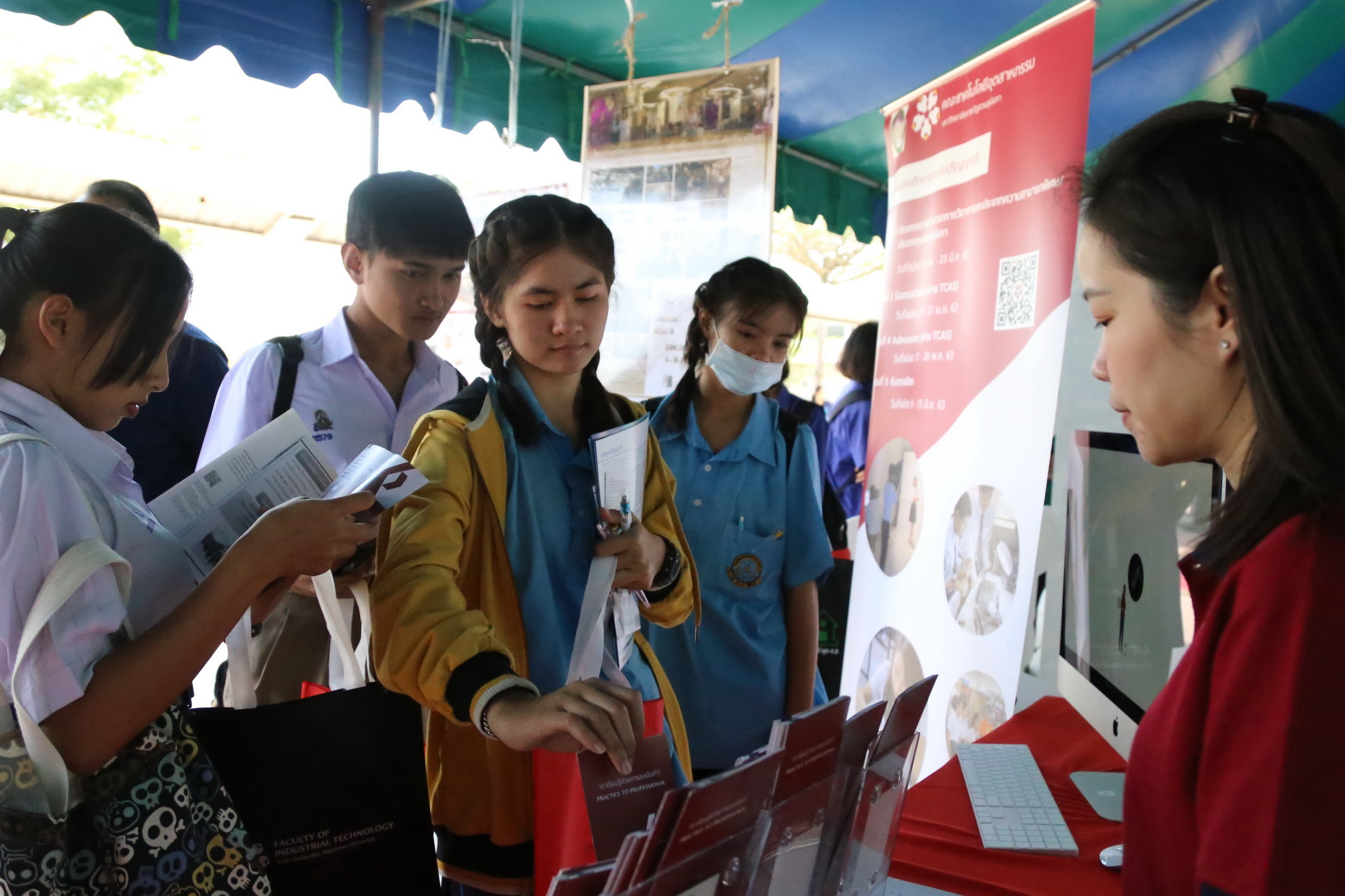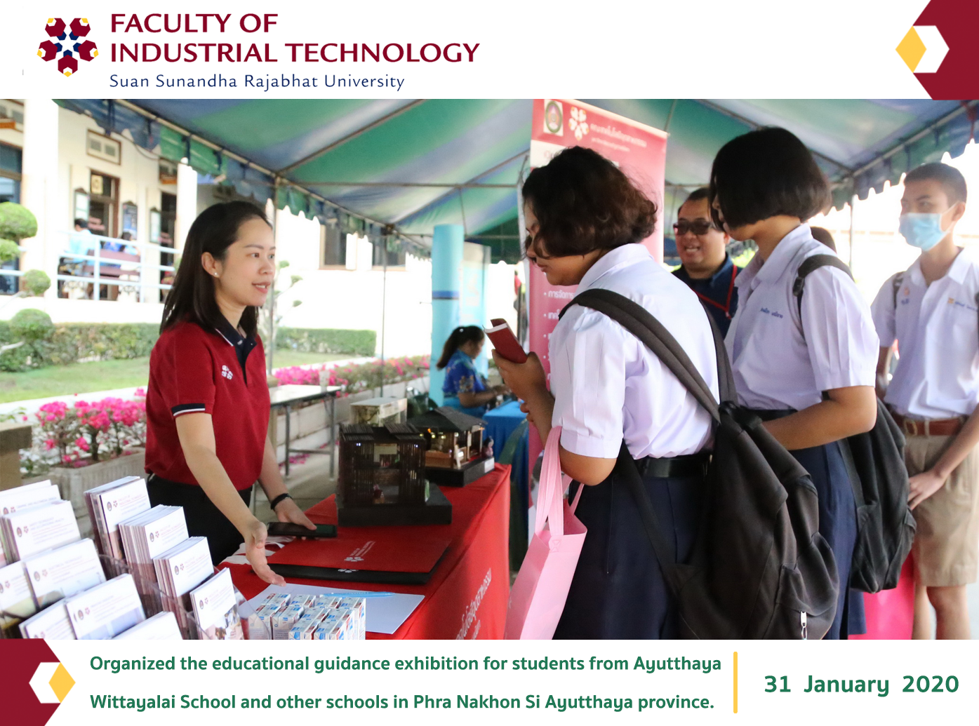 On January 31, 2020, the Public Relations Department, the Faculty of Industrial Technology, organized the educational guidance exhibition for students from Ayutthaya Wittayalai School and other schools in Phra Nakhon Si Ayutthaya province. This event was collaborated by Mr. Kittisak Techakanjanakit, the representative student from the Department of Interior and Exhibition Design as well as the Department of Computer Engineering, in organizing this activity for high school students who would like to continue their bachelor’s degree in the Faculty of Industrial Technology in order to provide them useful information on offered programs as well as in-depth educational guidance from teachers and students who are studying in the Faculty of Industrial Technology.