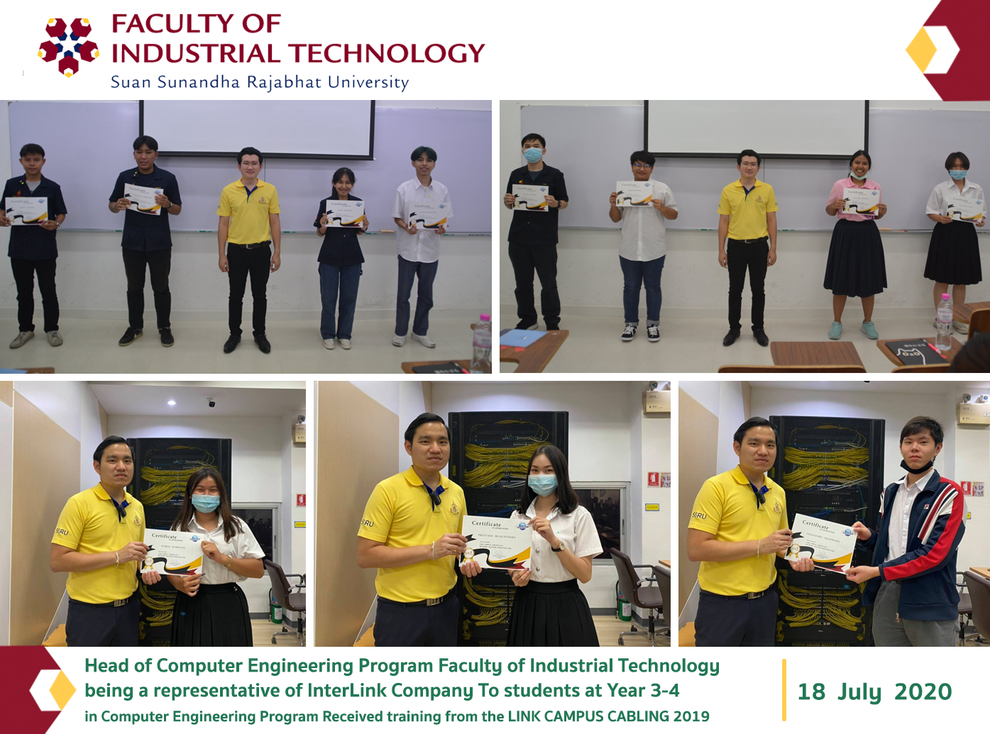 On the 18th and 20th July 2020, Dr.Sethakarn Prongnuch Head of Computer Engineering Program Faculty of Industrial Technology and Apisit Rattanatranurak Lecturer in Computer Engineering Program Faculty of Industrial Technology being a representative of InterLink Company To students at Year 3-4 in Computer Engineering Program Received training from the LINK CAMPUS CABLING 2019 project at room 3111, building 31, office of academic resources and room 4704, building 47, Faculty of Industrial Technology Suan Sunandha Rajabhat University