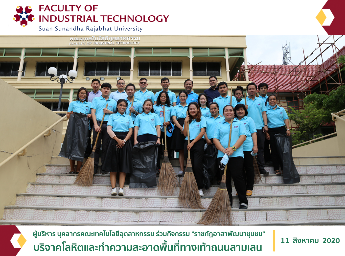 On August 11, 2020, at 09.30, the executives and personnel of the Faculty of Industrial Technology participated in the “Rajabhat Volunteers for Community Development” that included activities in donating blood as well as cleaning pedestrian around Samsen Road by starting from the side of the Cabinet and Royal Gazette Publishing Office to the garden in front of Tha Wasukri in order to present as a royal charity on the auspicious occasion of the birthday of Her Majesty Queen Sirikit The Queen Mother.